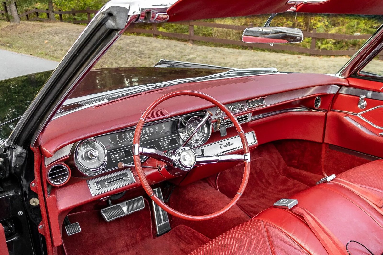 The interior was overhauled and features seating surfaces with red leather upholstery as well as a color-coordinated dashboard, door panels, and carpeting, the latter of which is protected by floor mats embroidered with Cadillac crests.