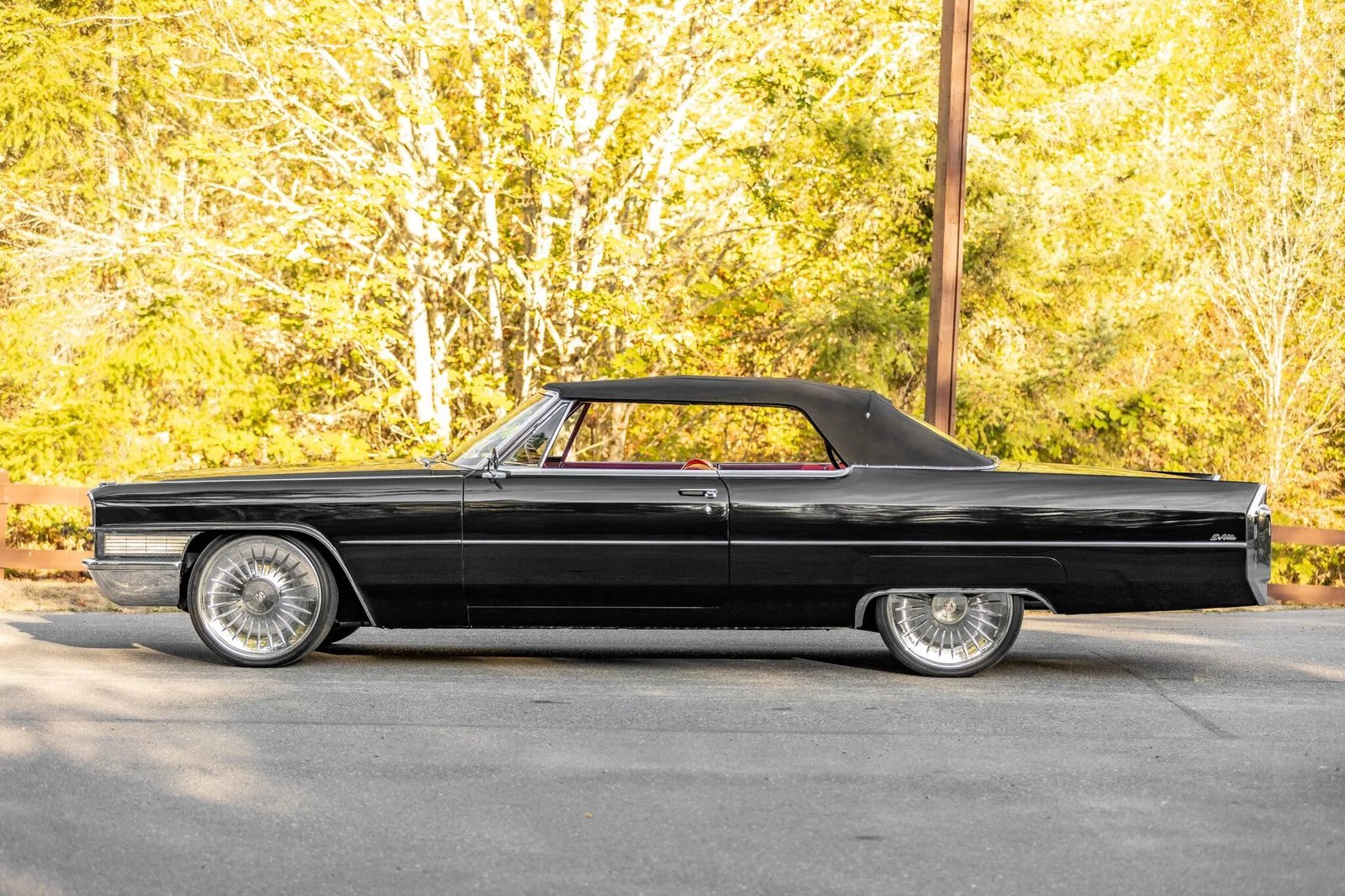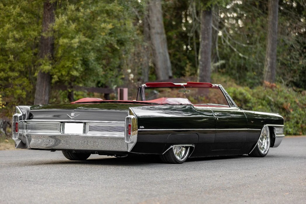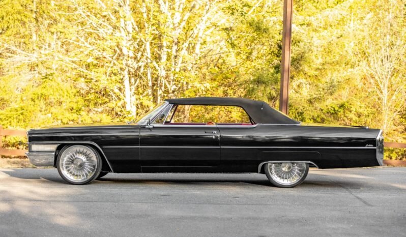 Power comes from a 429ci V8 mated to a three-speed automatic transmission, and equipment includes a replacement convertible top, quad headlights, and power steering, while modifications consist of an adjustable air suspension, 22″ wheels, LED lighting, and a Kenwood stereo.