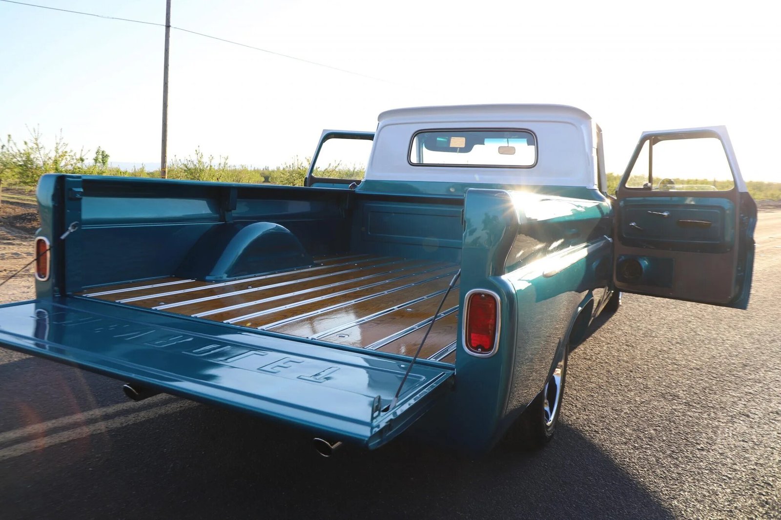 The truck have been media blasted and refinished in the current Bright Aqua Metallic and white in 2011, and a replacement chrome front bumper and windshield were installed.