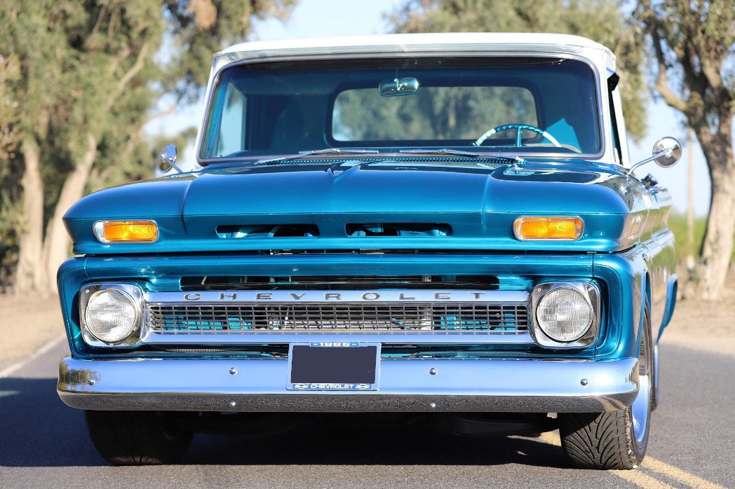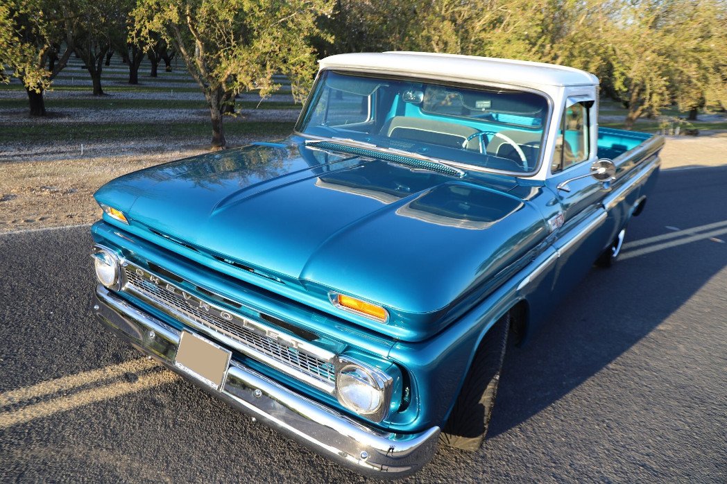 This 1965 Chevrolet C10 is a long-bed Fleetside pickup that has been refurbished and modified, and is finished in metallic blue and white over a gray and black cloth interior.