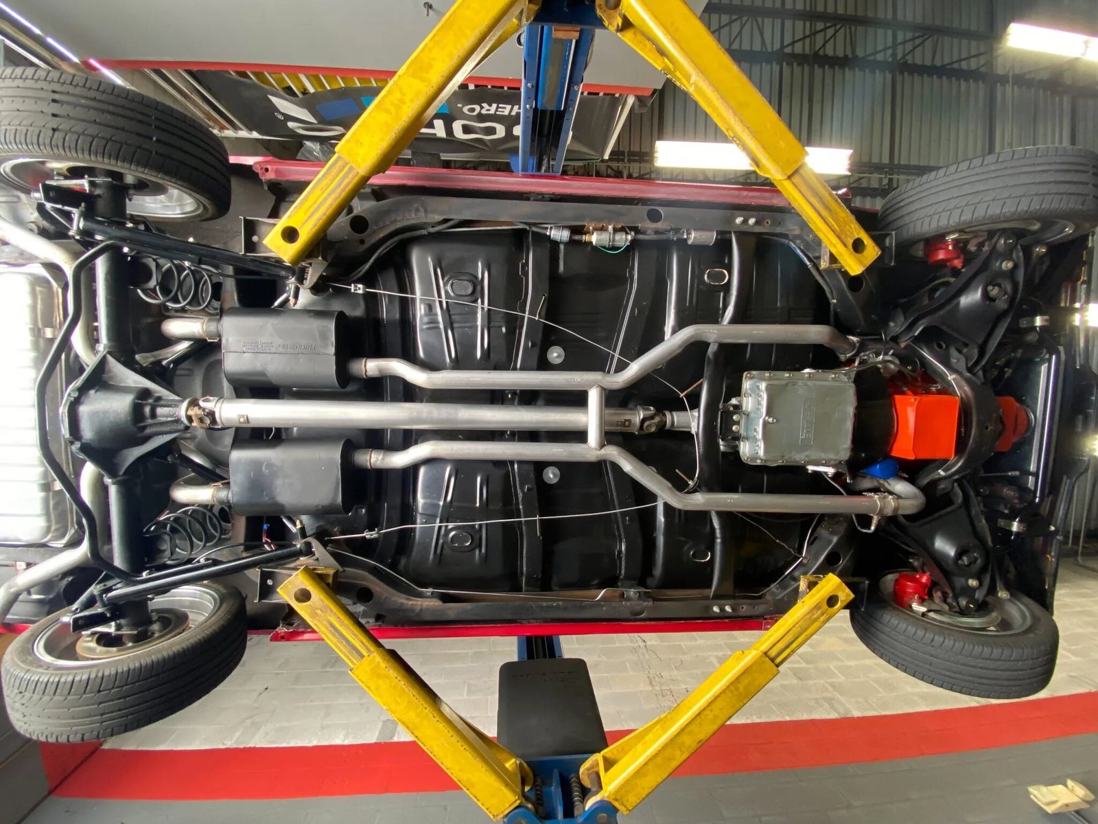Stopping power is provided by four-wheel disc brakes with a Wilwood hydraulic cylinder, and the car features Hotchkis sway bars and rear trailing arms.