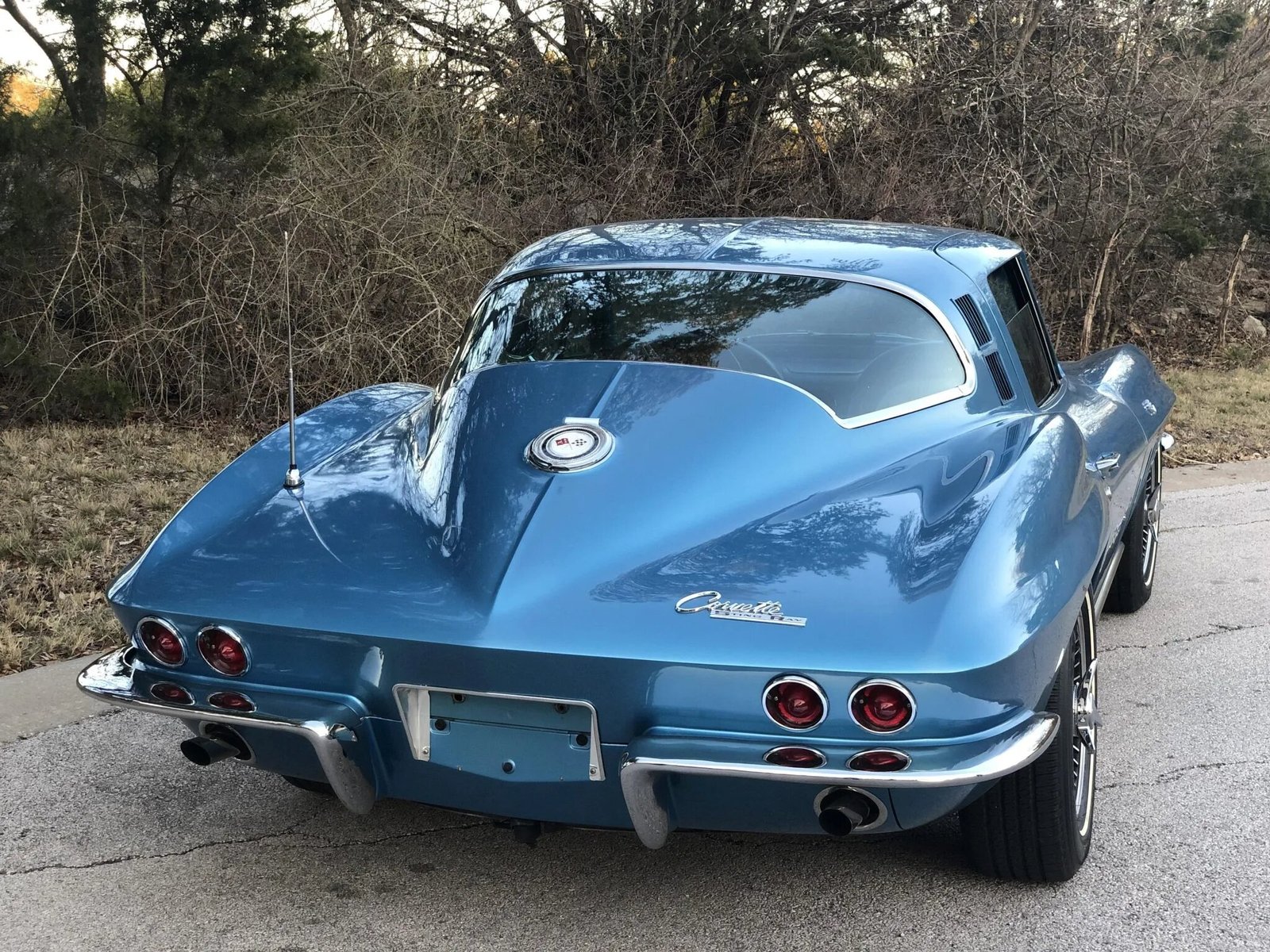 The fiberglass coupe bodywork is finished in Nassau Blue and features a driver-side mirror, concealed headlights, vents on the rear pillars, cast rocker accents, split chrome bumpers, and dual exhaust outlets that exit through the rear valance.