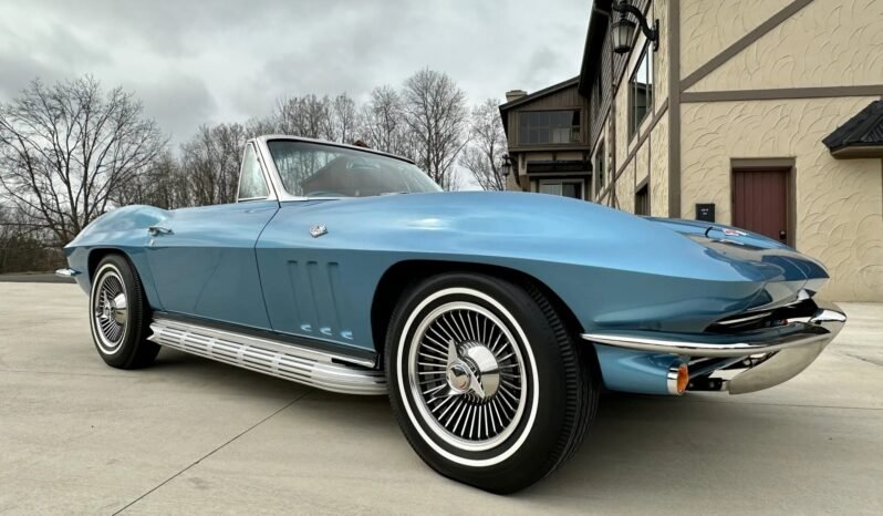 The car is powered by a 327ci V8 paired with a four-speed manual transmission, and additional equipment includes turbine-style 15″ alloy wheels, four-wheel disc brakes, and Bilstein shocks in addition to retractable headlights, fender vents, side-exit exhaust pipes, lap belts, a teak steering wheel, and a vertically mounted Delco push-button radio.