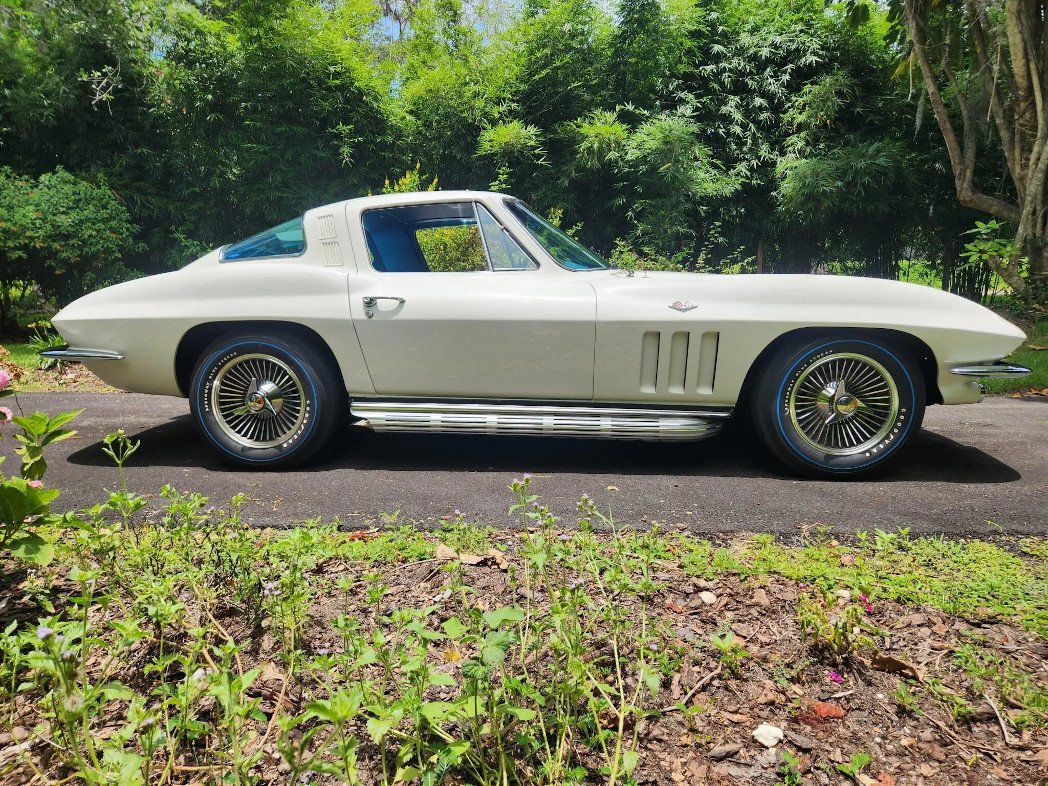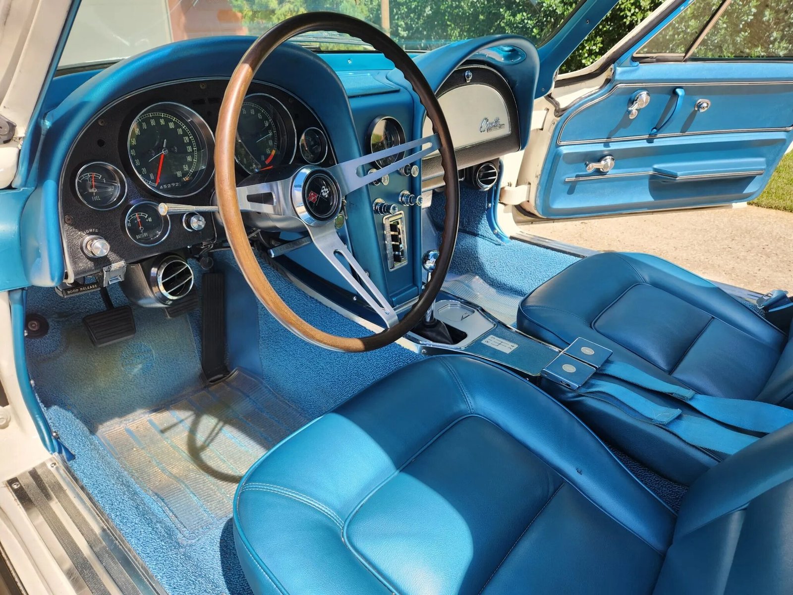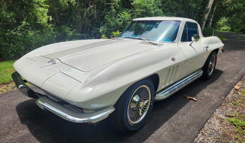 This 1965 Chevrolet Corvette coupe is finished in Ermine White over blue vinyl upholstery and is powered by a 327ci V8 linked to a four-speed manual transmission and a Positraction differential. Features include pop-up headlights, split chrome bumperettes, 15″ knock-off wheels, four-wheel disc brakes, side-exit exhaust pipes, an analog clock, air conditioning, and an AM/FM radio.
