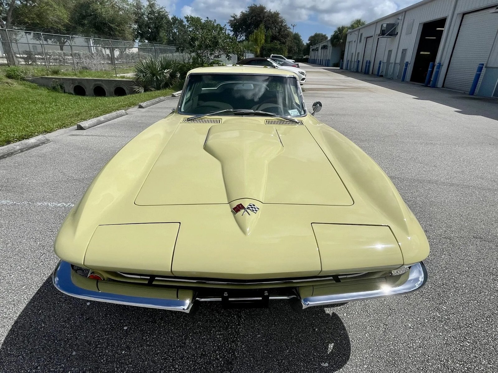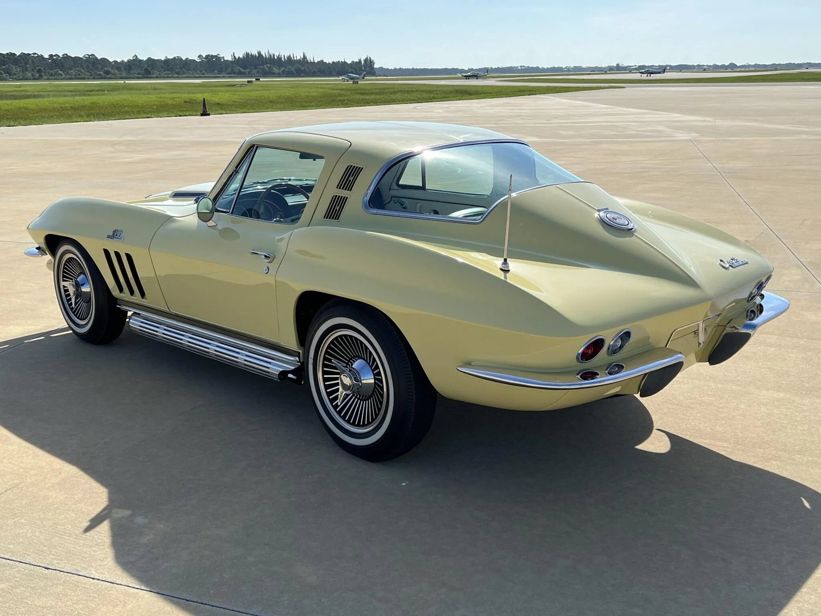 The fiberglass body was factory-finished in Goldwood Yellow and was refinished. Details include a “power bulge” hood, flip-up headlights, chrome bumpers, fender vents, a side-exit exhaust system, and a retractable antenna.