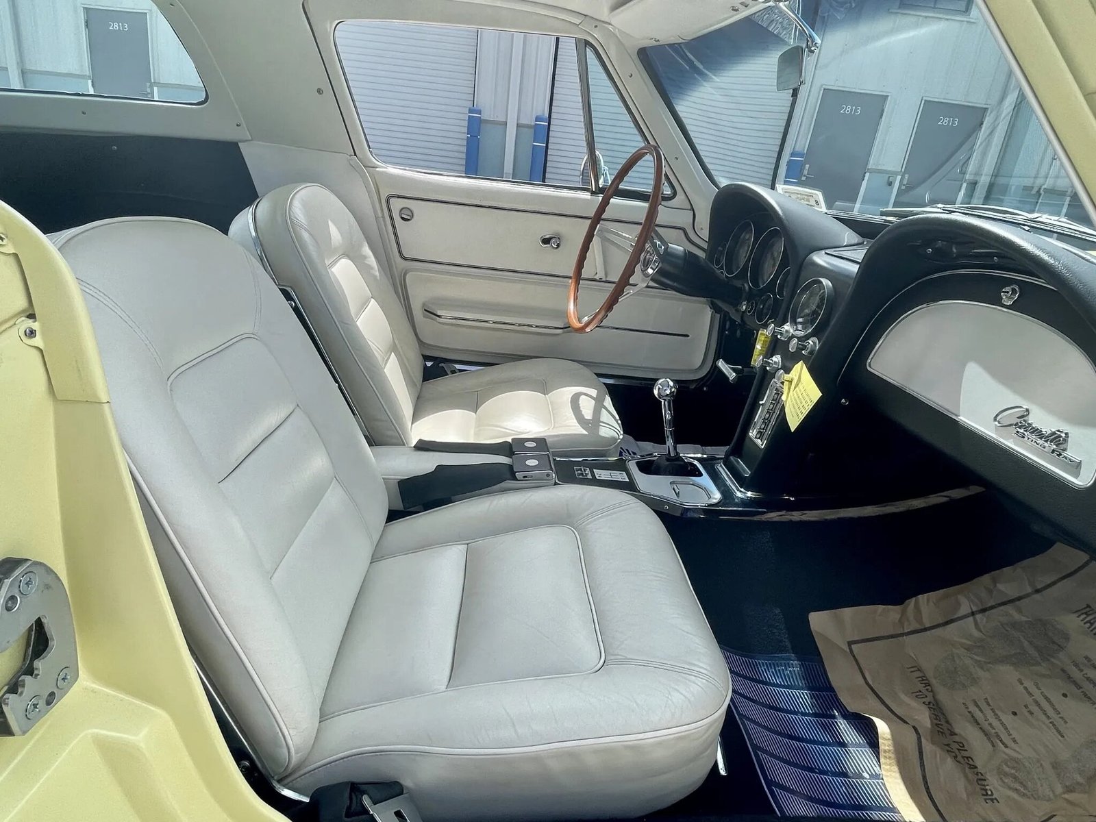 The cabin features two bucket seats upholstered in white leather joined by color-coordinated door panels and a black dashboard and center console. Appointments include a heater, a reverse-lockout shifter, an analog clock, power windows, and lap belts.