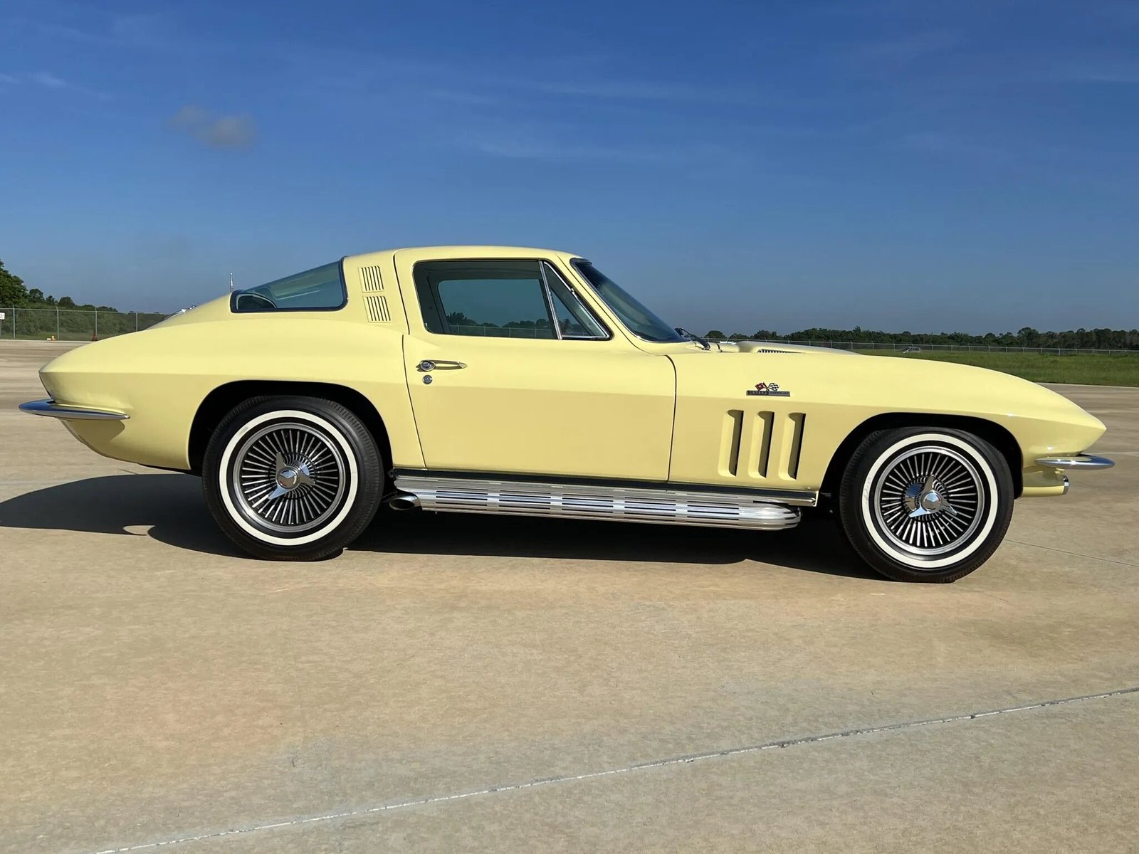 This 1965 Chevrolet Corvette coupe was initially delivered to British Columbia, Canada, and was awarded an NCRS Top Flight award in 1995 and Bloomington Gold certification in 2020. Finished in Goldwood Yellow over white leather upholstery, the car is powered by a 396ci L78 V8 paired with a Muncie four-speed manual transmission. Additional equipment includes a PosiTraction differential, 15″ cast aluminum wheels, four-wheel disc brakes, side-exit exhaust outlets, power windows, chrome bumpers, and an AM/FM radio.