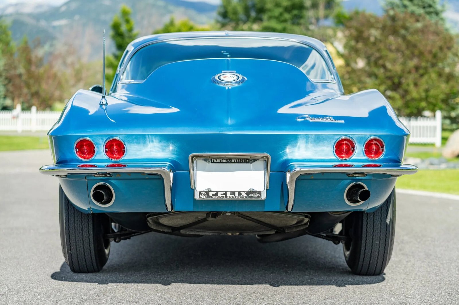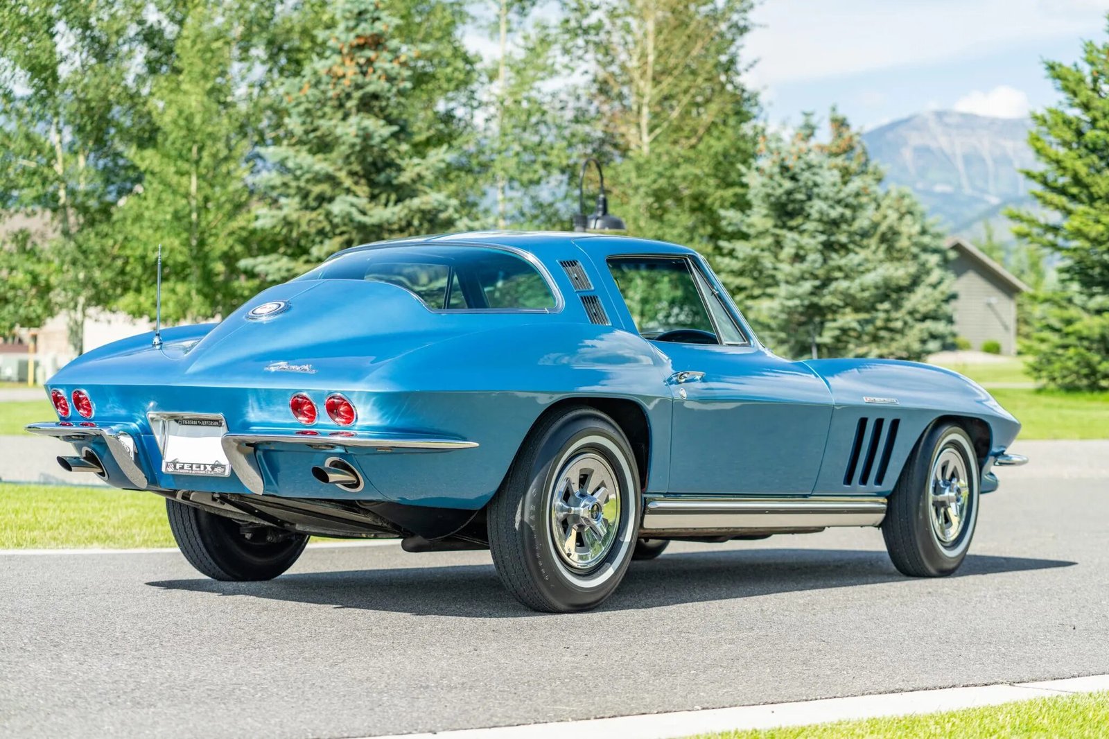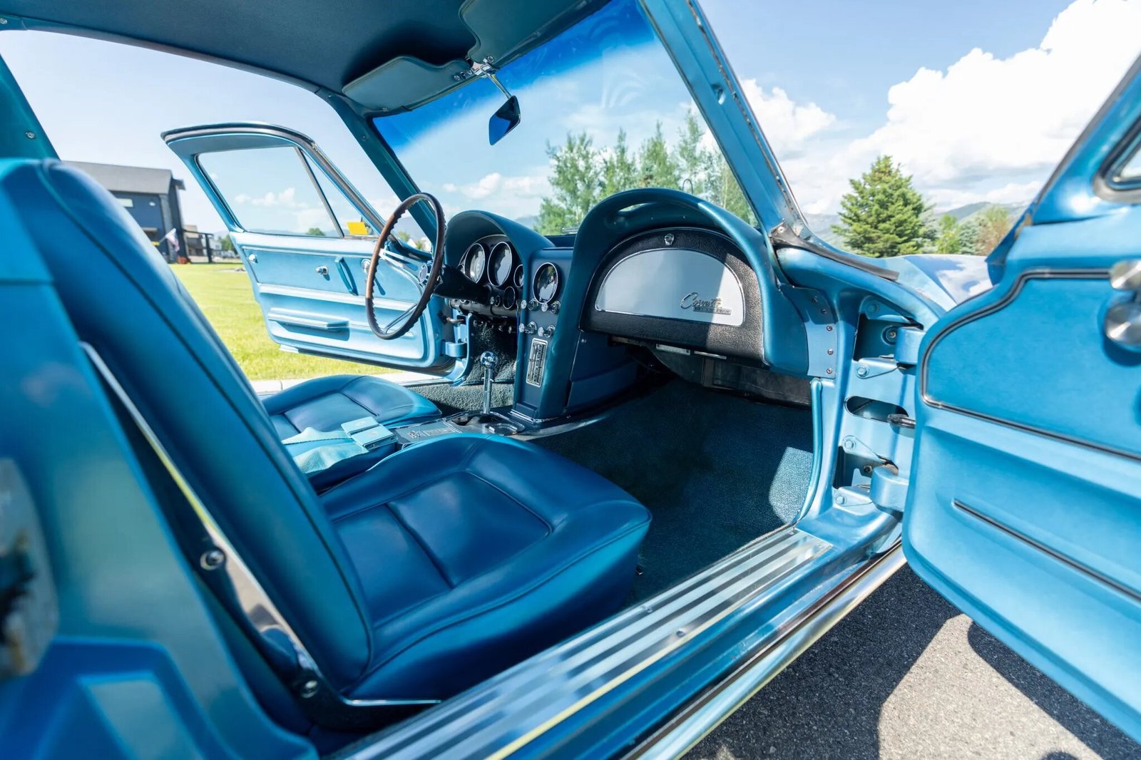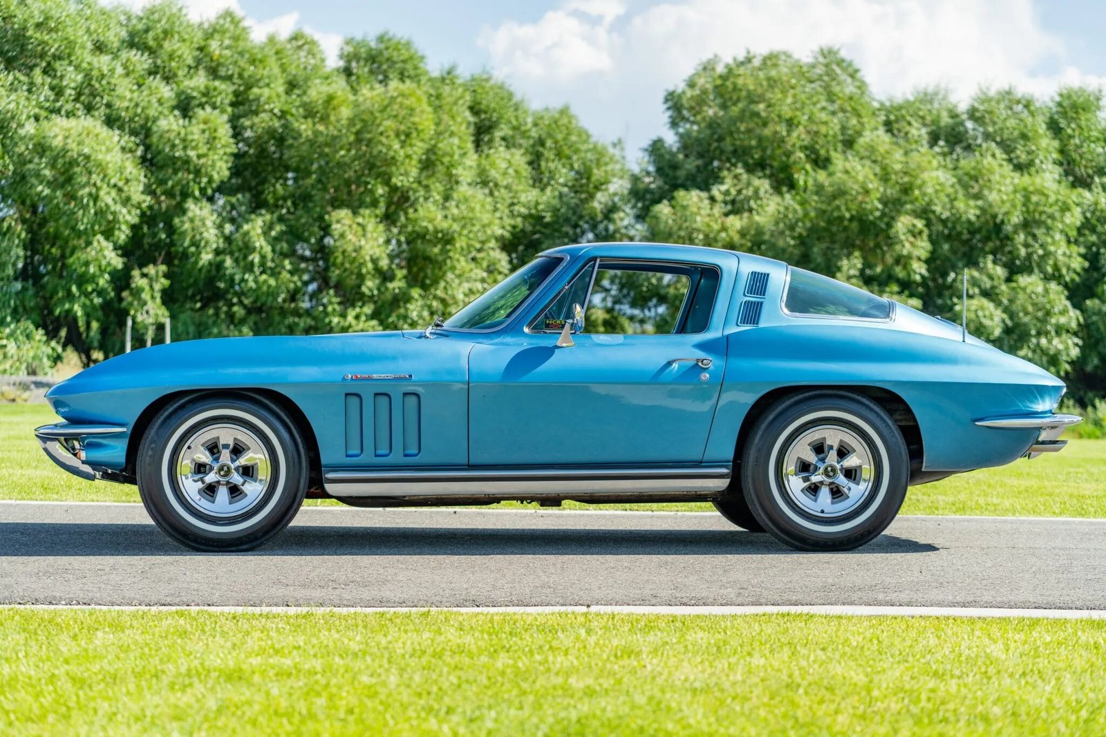The fiberglass body is finished in Nassau Blue, and features include flip-up headlights, chrome bumpers, fender vents, Soft Ray tinted glass, a driver-side mirror, and a retractable antenna.