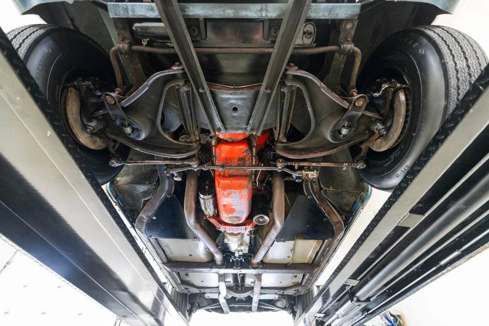 Steel 15″ wheels feature faux-knock-off covers and are mounted with 7.75-15 Goodyear tires. The C2 was the first Corvette to offer fully independent suspension, with upper and lower control arms at the front and a three-link setup with a transverse leaf spring at the rear. Braking is handled by four-wheel discs.