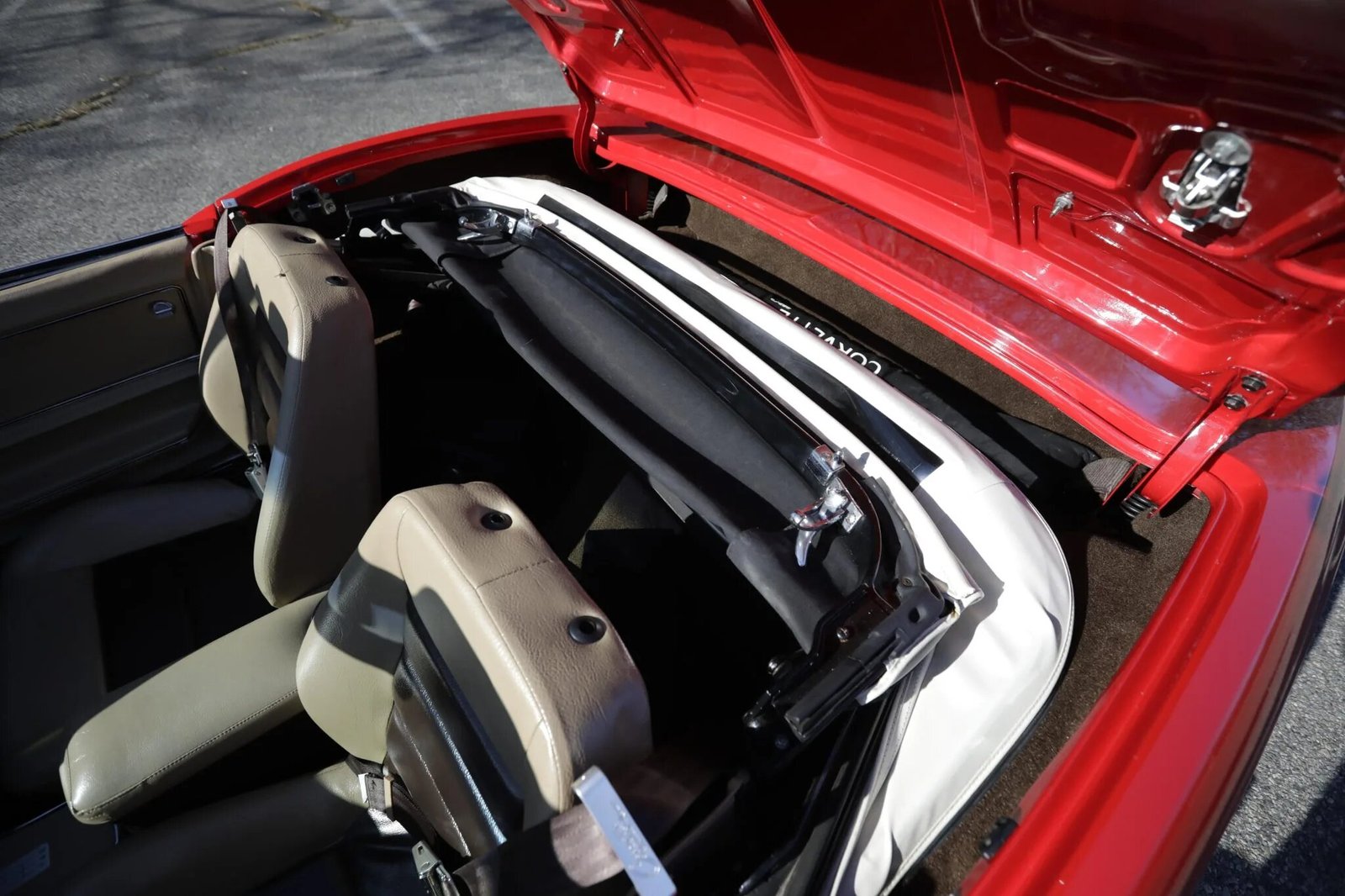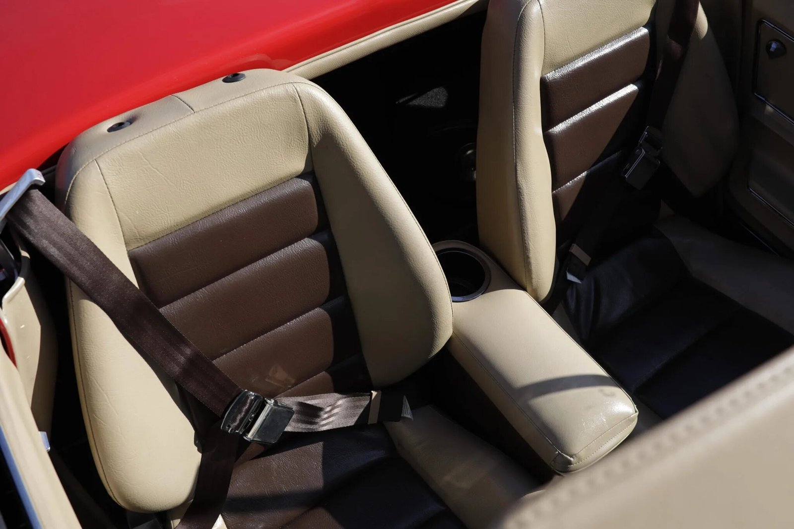 The cockpit features bucket seats upholstered in tan vinyl with brown inserts as well as a two-tone dash, tan door panels, and brown carpeting protected by brown rubber floor mats.