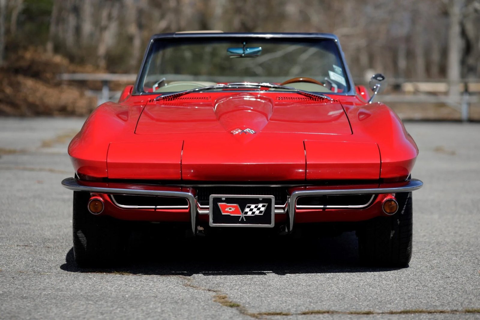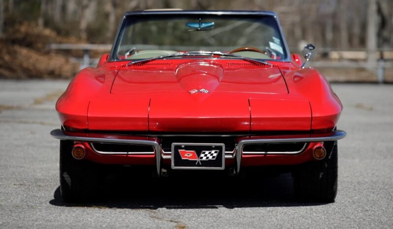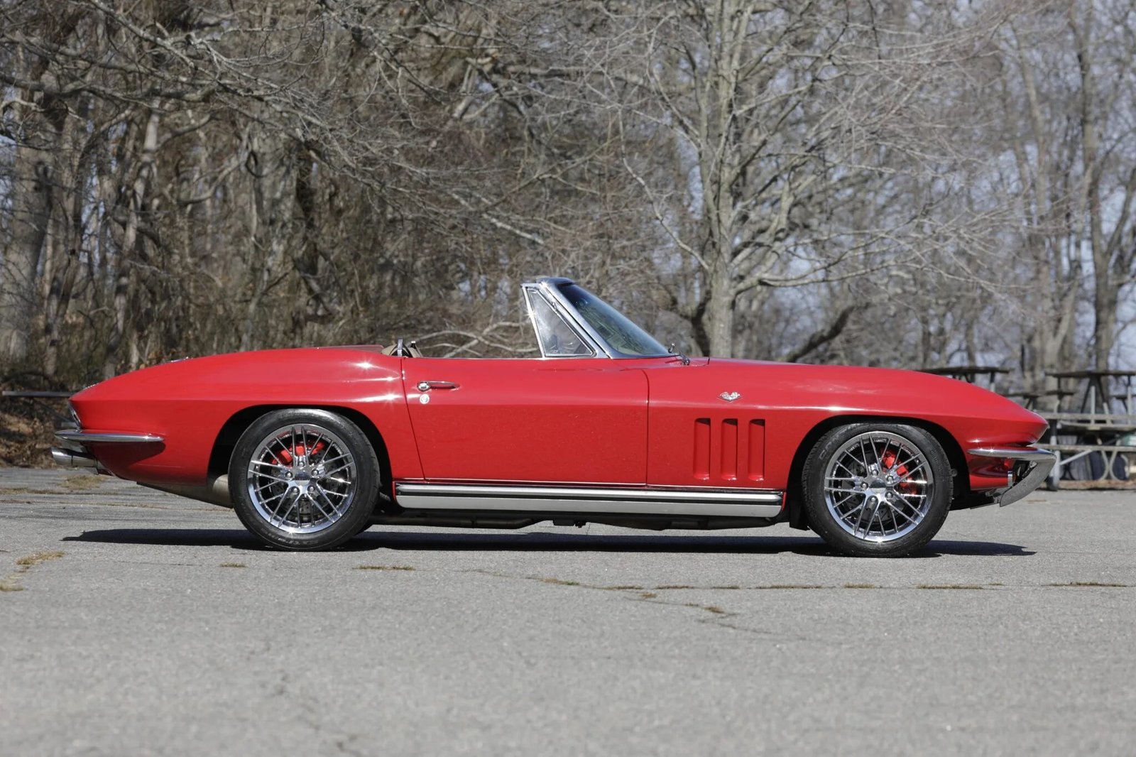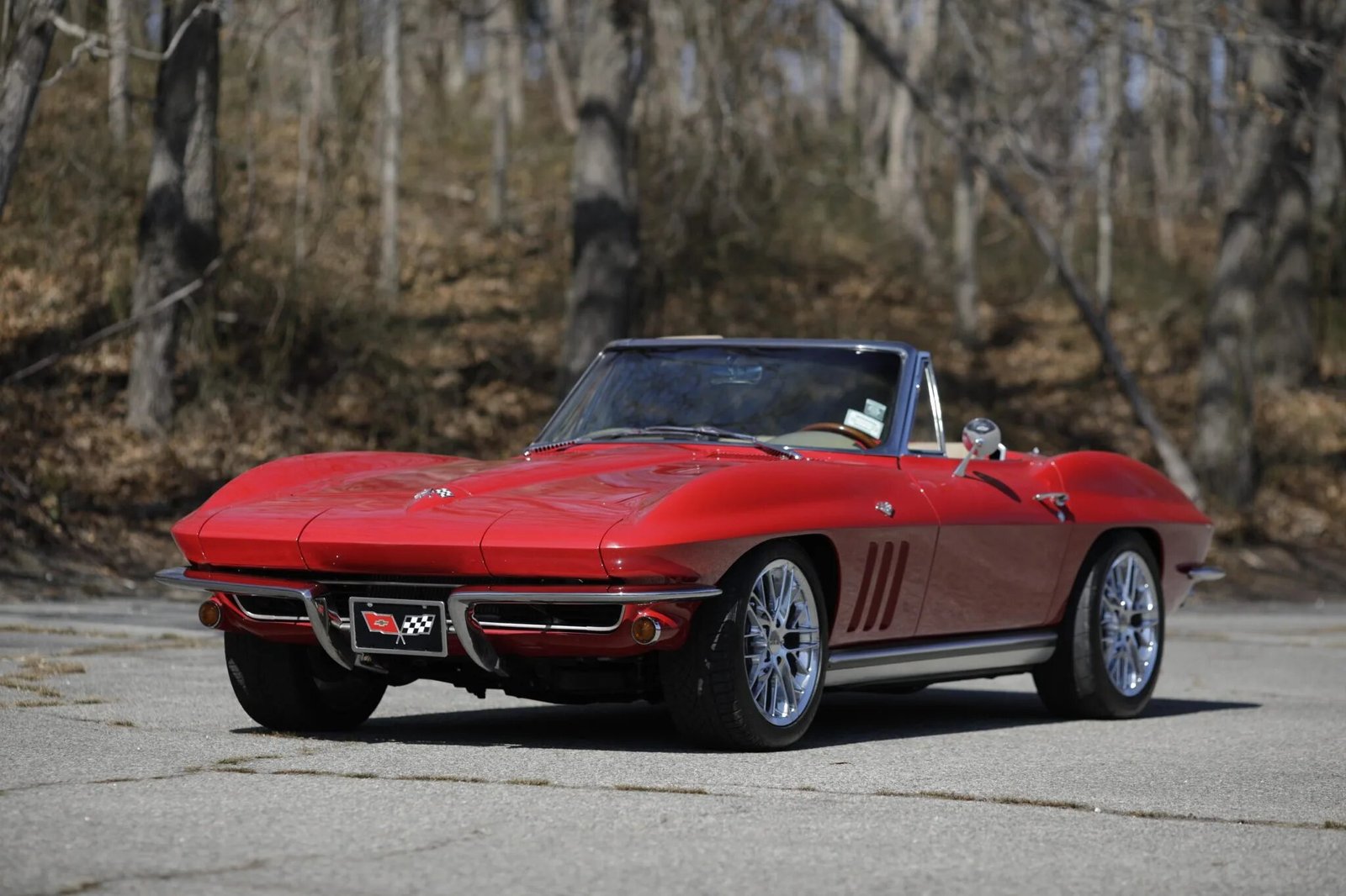 The car received a three-stage repaint in red during the refurbishment and features a replacement white soft top, retractable rotating headlights, wraparound split bumpers, bright rocker-panel trim, functional front-fender vents, a driver-side mirror, and quad exhaust tips exiting through the rear valance.