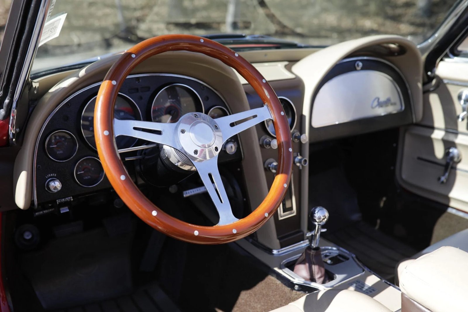 A three-spoke wood-rimmed steering wheel atop a tilting column fronts a Dakota Digital VHX Instrument System insert housing a carbon-fiber-look 160-mph speedometer, a matching 8k-rpm tachometer with an inset digital clock, and gauges for fuel level, voltage, oil pressure, and coolant temperature.