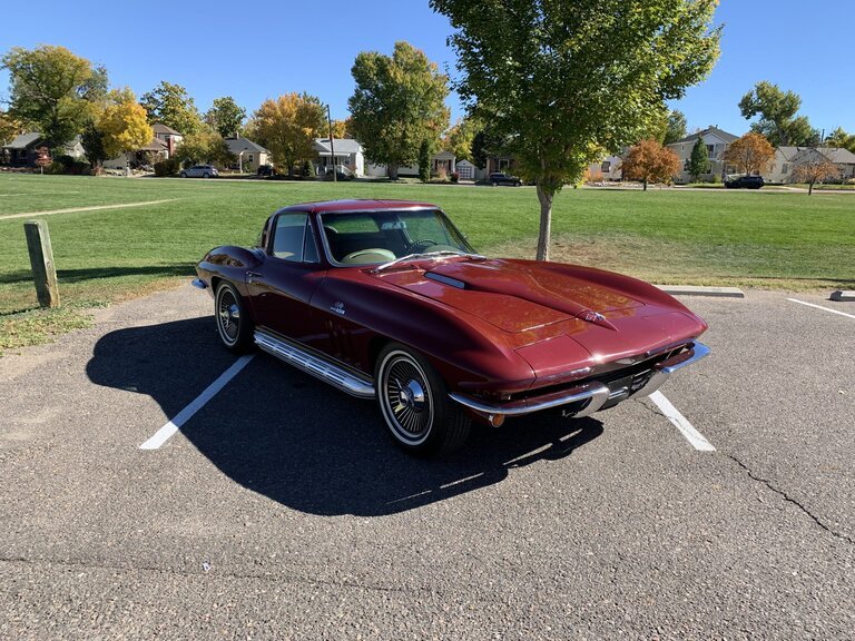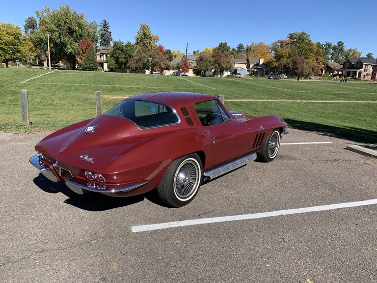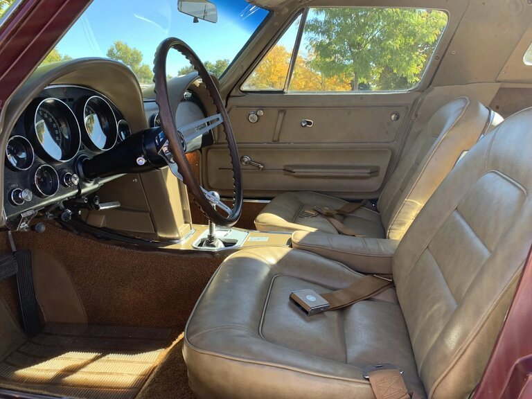 This 1965 Chevrolet Corvette is an A.O. Smith-bodied coupe finished in Milano Maroon over Saddle upholstery and powered by a 396ci V8 paired with a four-speed manual transmission.