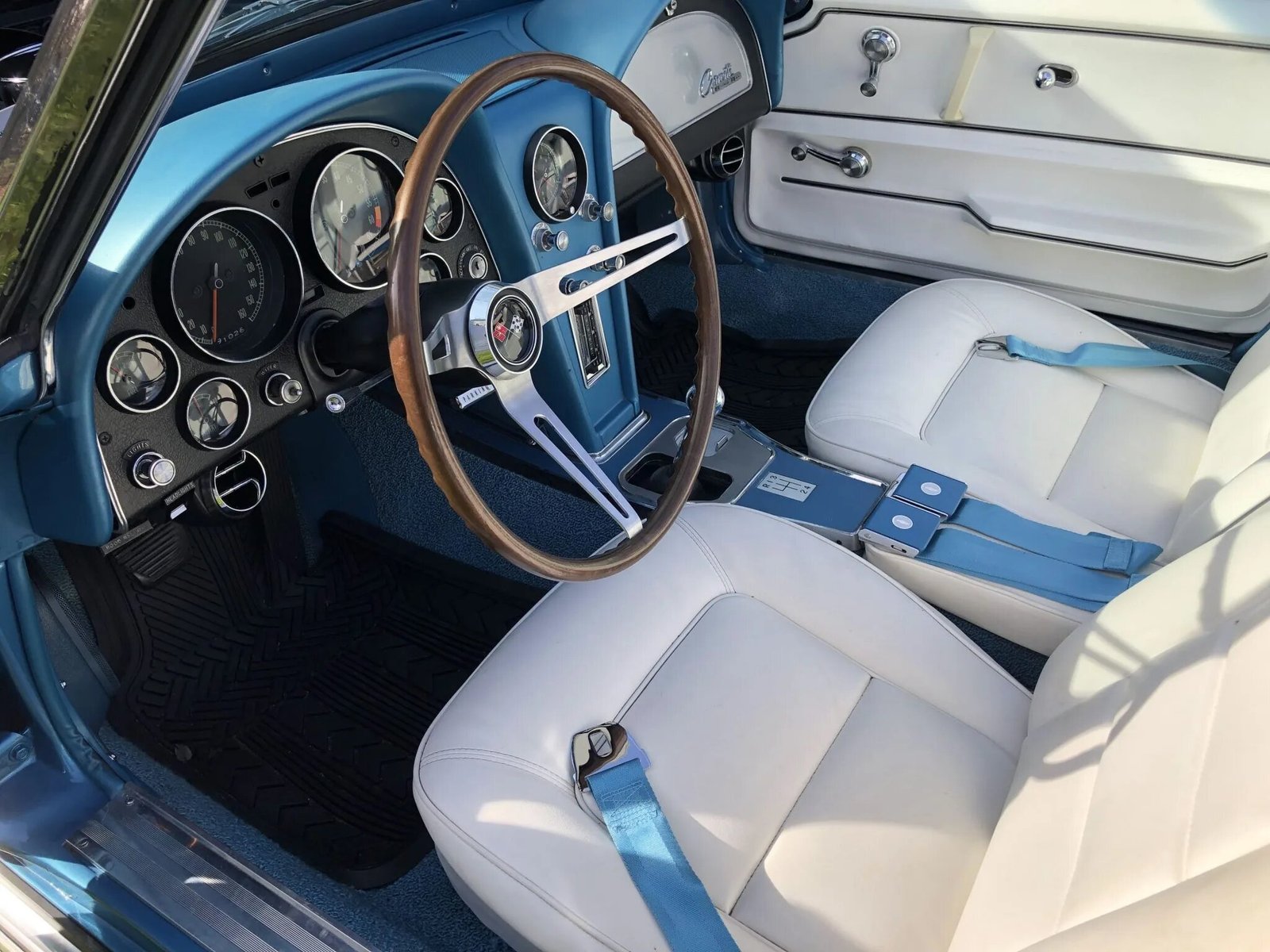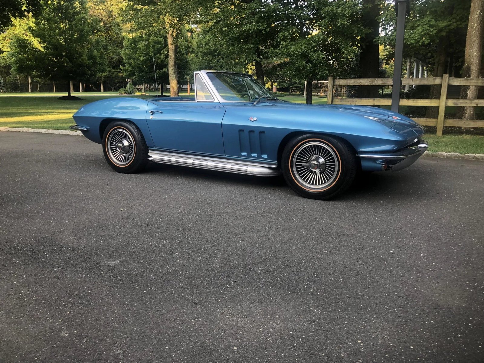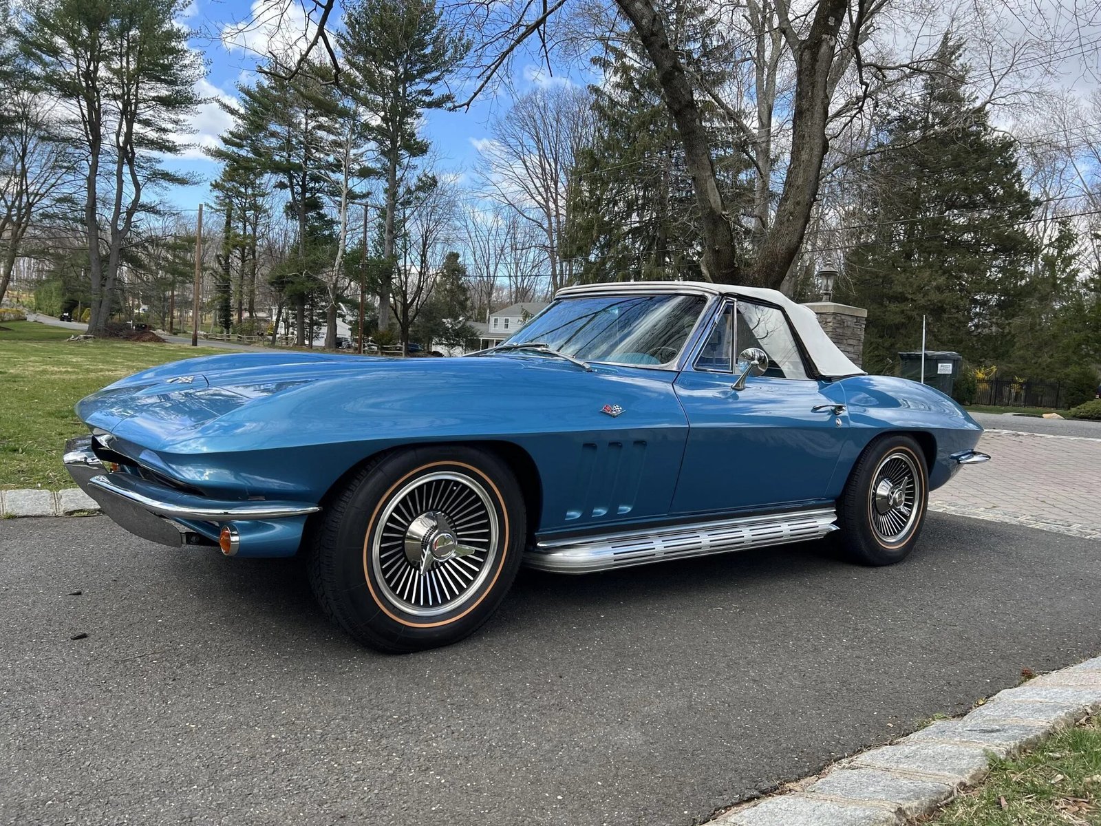 This 1965 Chevrolet Corvette convertible is finished in Nassau Blue over white and powered by a numbers-matching 327ci V8 paired with a close-ratio four-speed manual transmission.