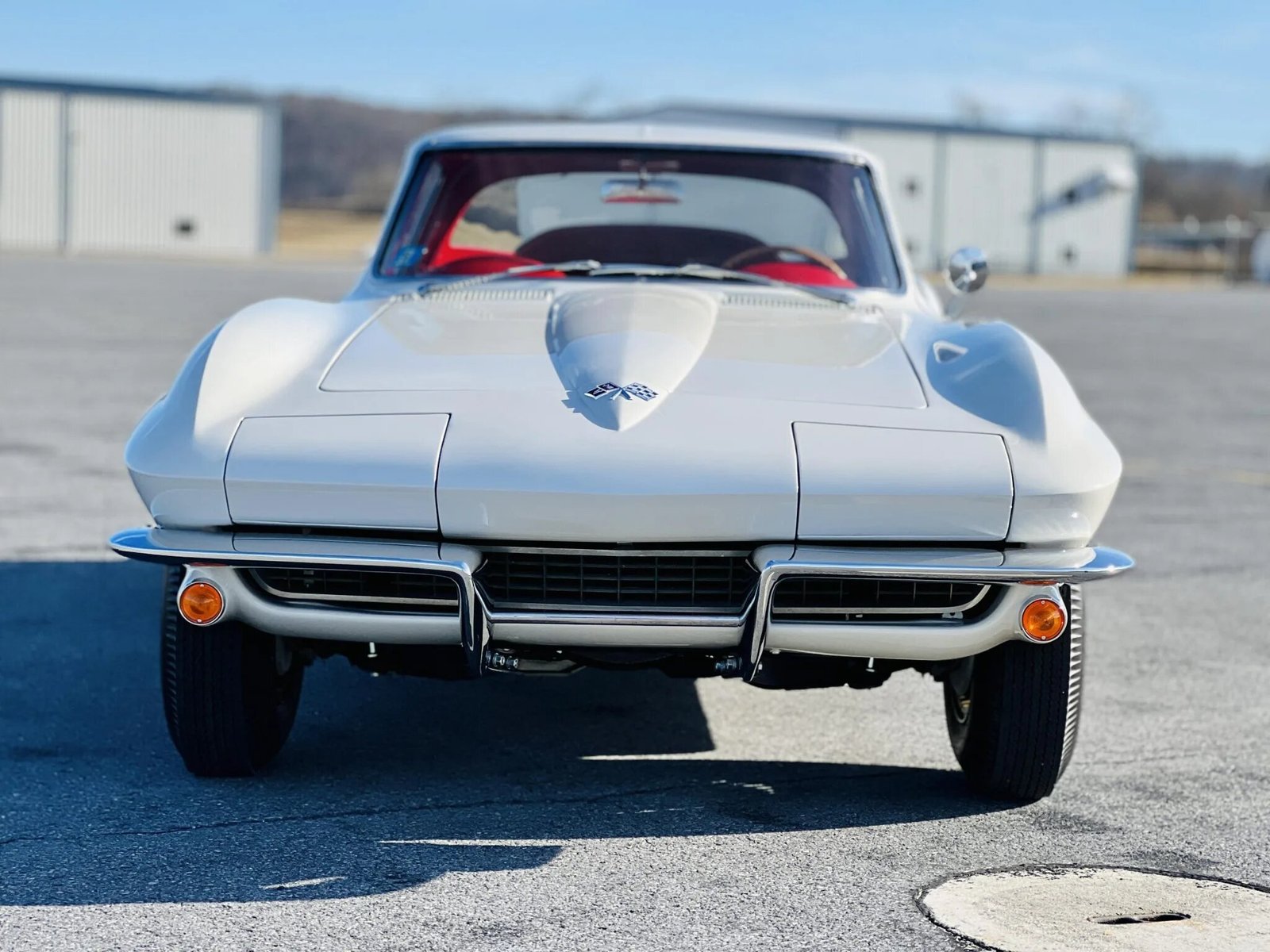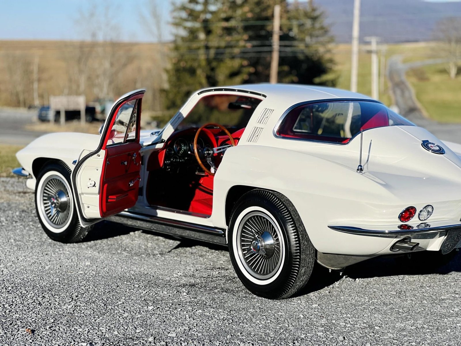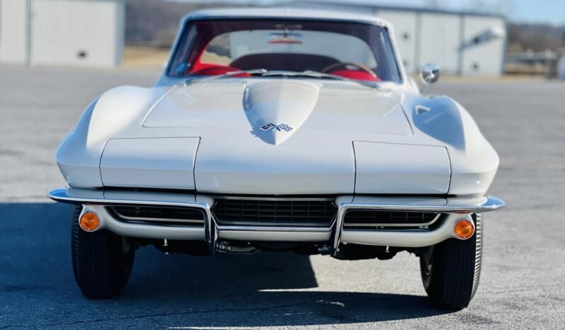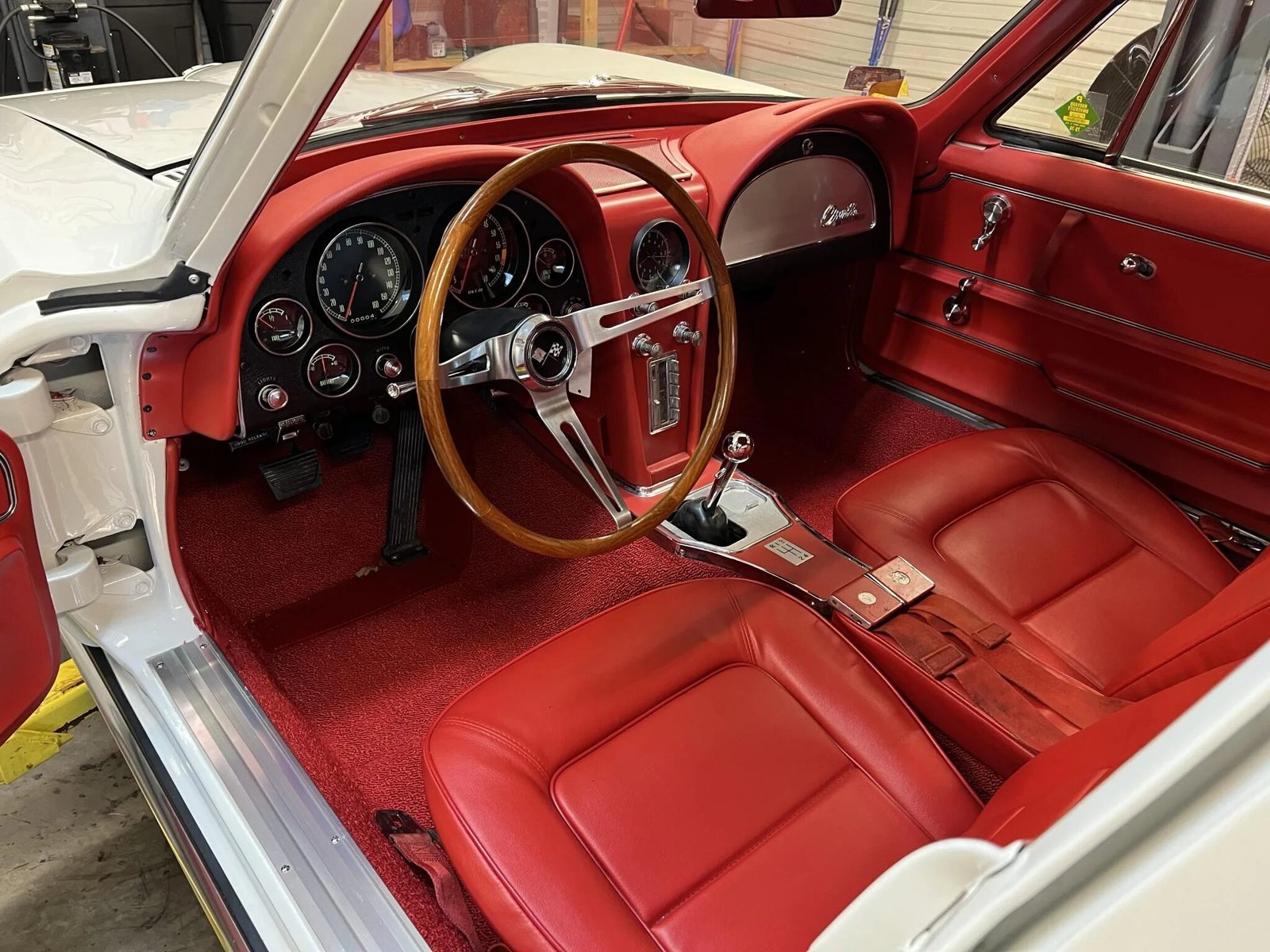 The car is finished in Ermine White over red vinyl and powered by a numbers-matching 327ci V8 paired with a four-speed manual transmission.