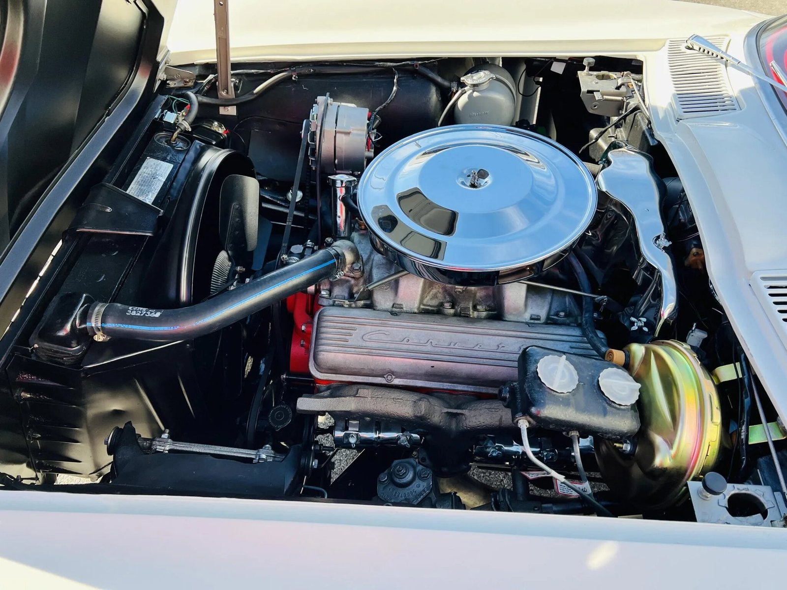 The 327ci V8 breathes through a four-barrel carburetor and was factory rated at 350 horsepower and 360 lb-ft of torque.