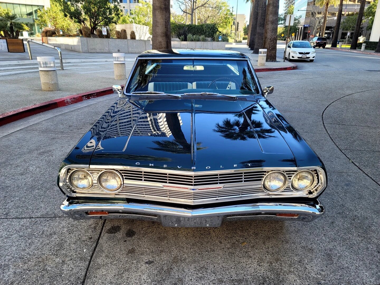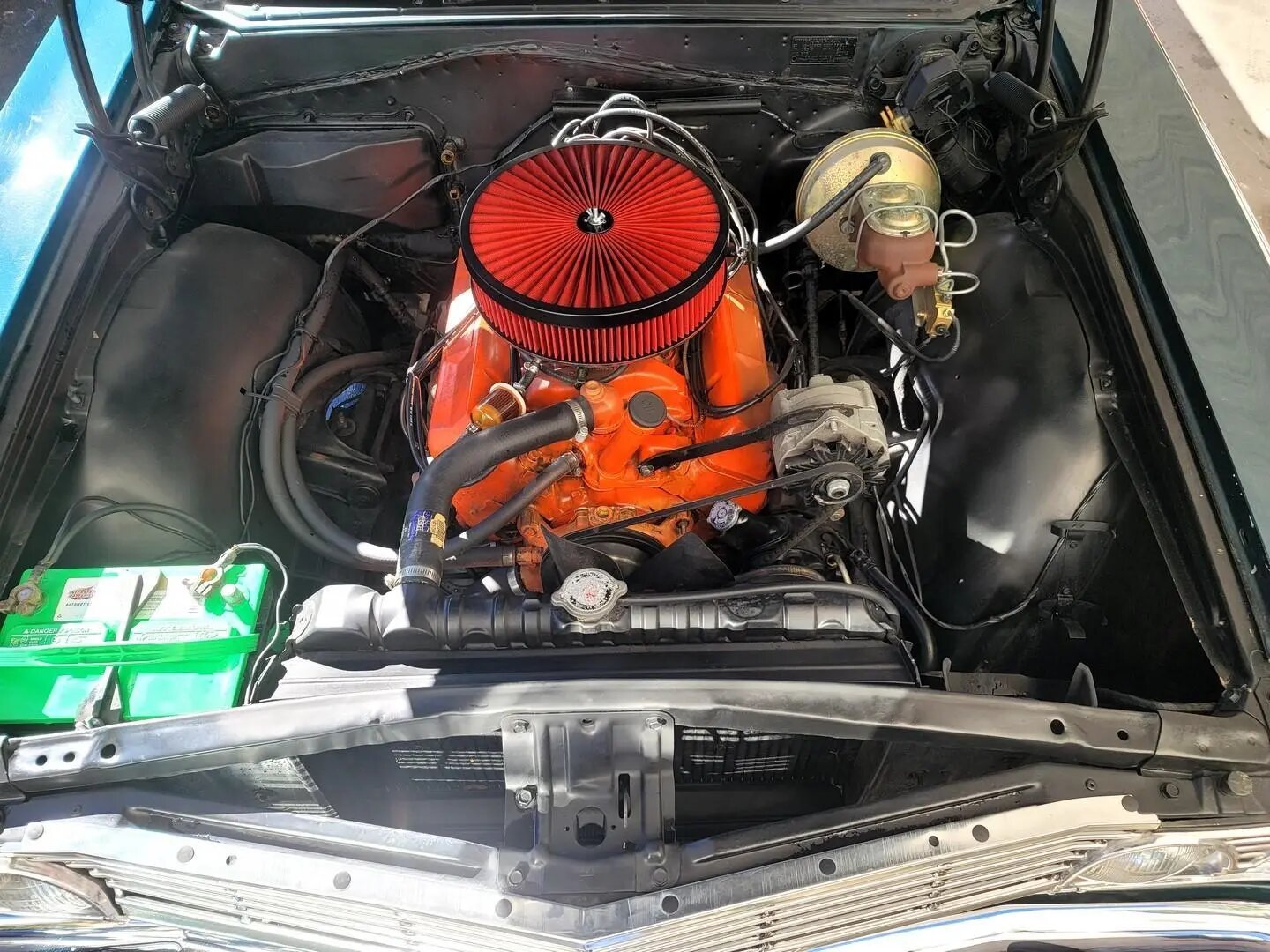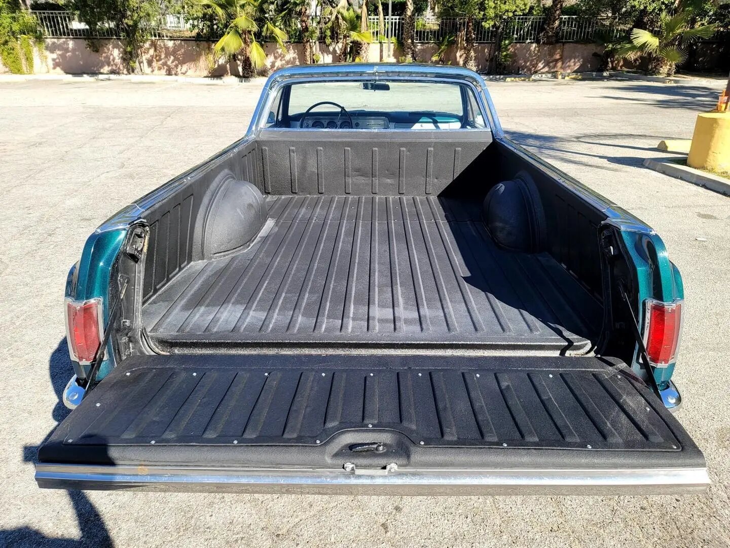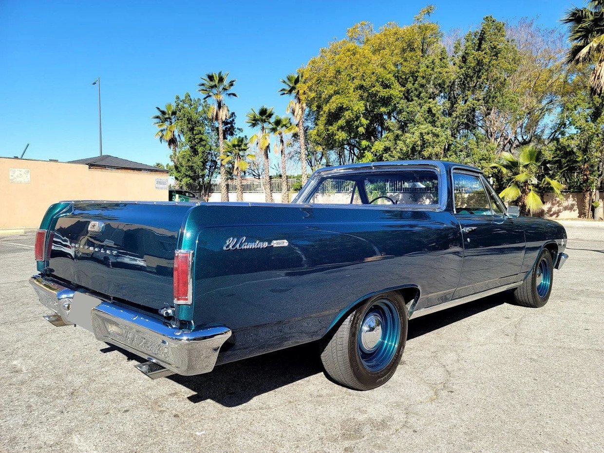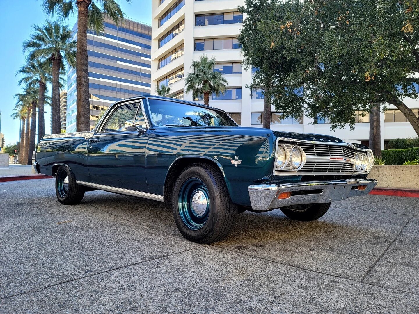 This 1965 Chevrolet El Camino is finished in metallic dark green over a white and green interior and powered by a 327ci V8 paired with a two-speed Powerglide automatic transmission.