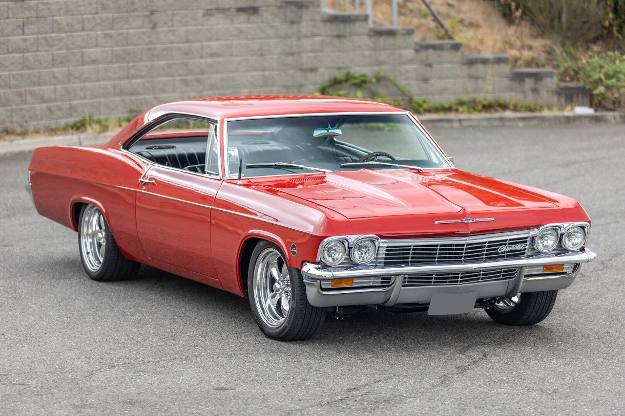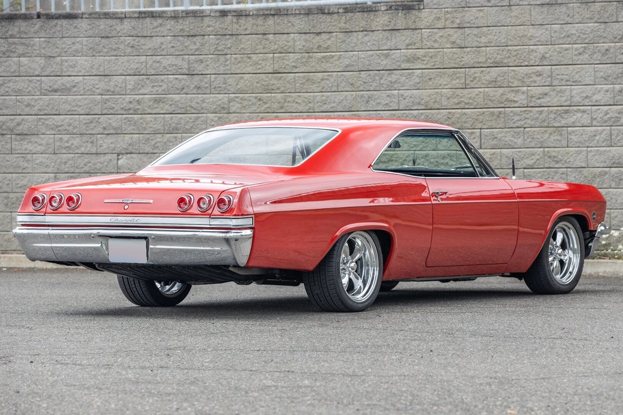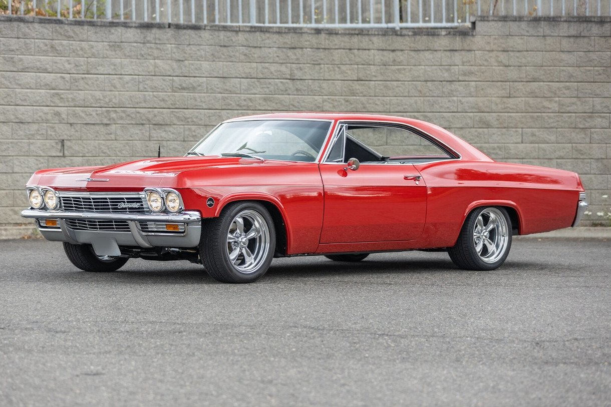 This 1965 Chevrolet Impala has been refurbished and modified, including the installation of a fuel-injected 496ci stroker V8 equipped with aluminum cylinder heads, Comp roller rockers, a Lunati camshaft, and Hedman headers.