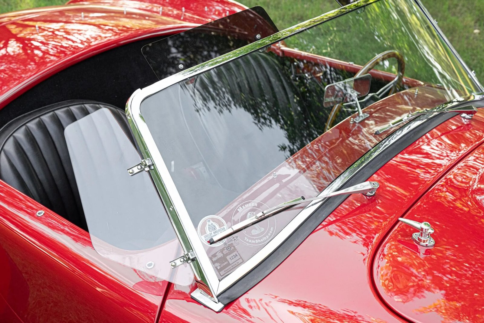 The glovebox door is signed by Carroll Shelby and a fire extinguisher, and battery cut-off switch are installed in the trunk.