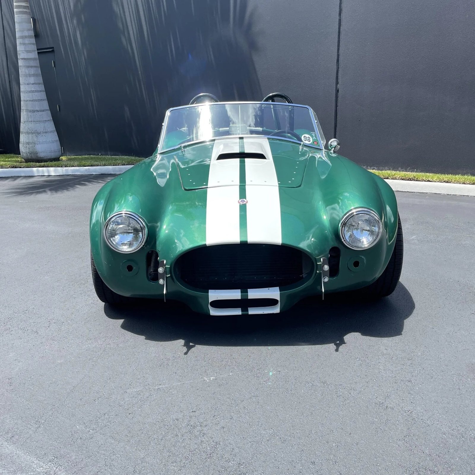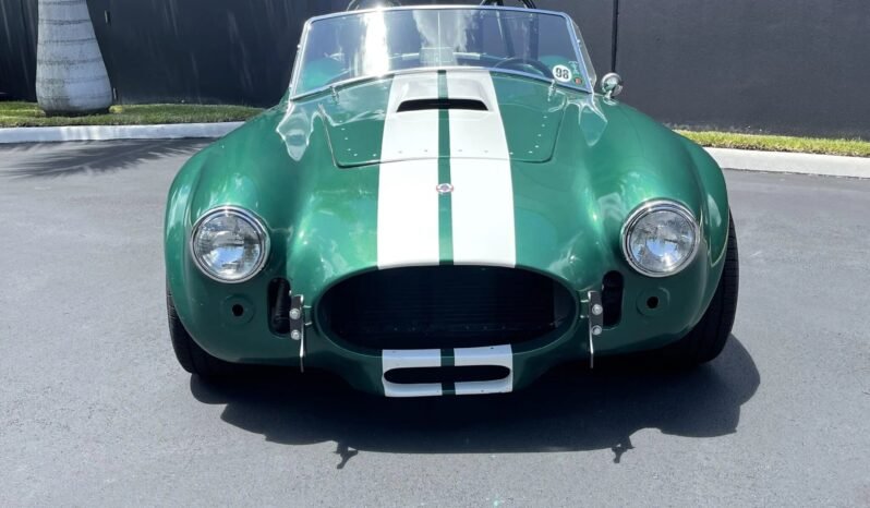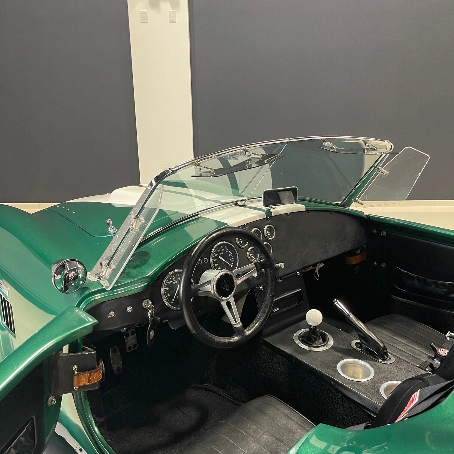 The car is finished in green with white stripes over black upholstery and is powered by a 302ci V8 paired with a five-speed manual transmission.