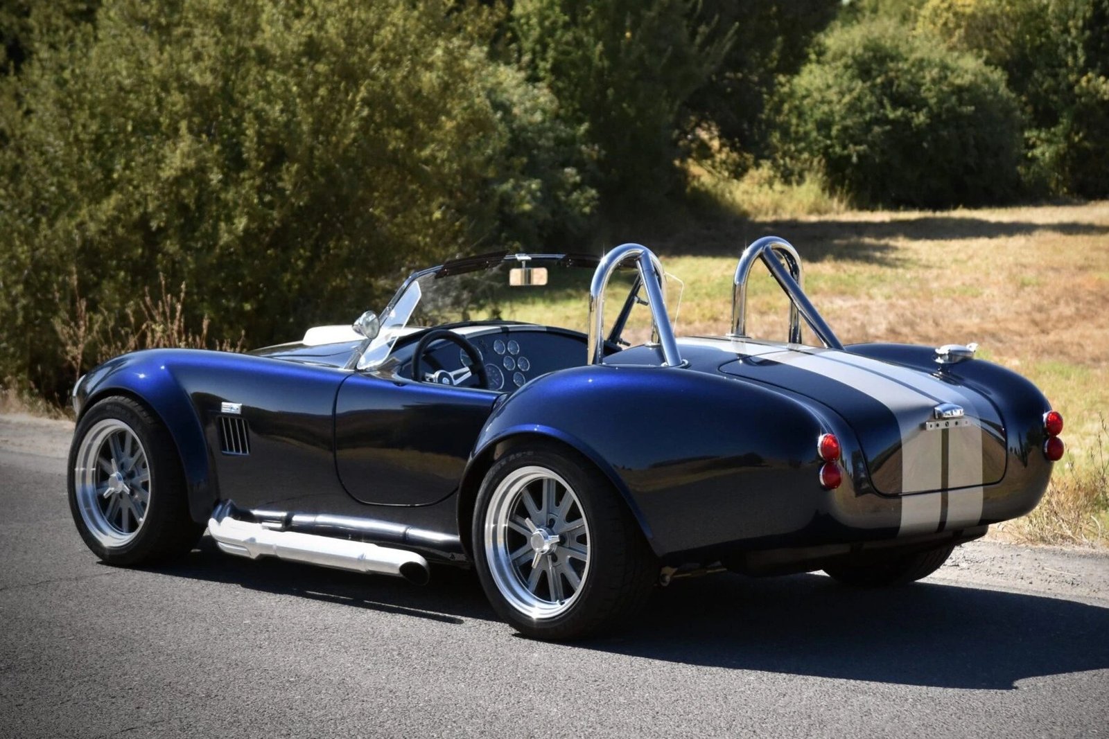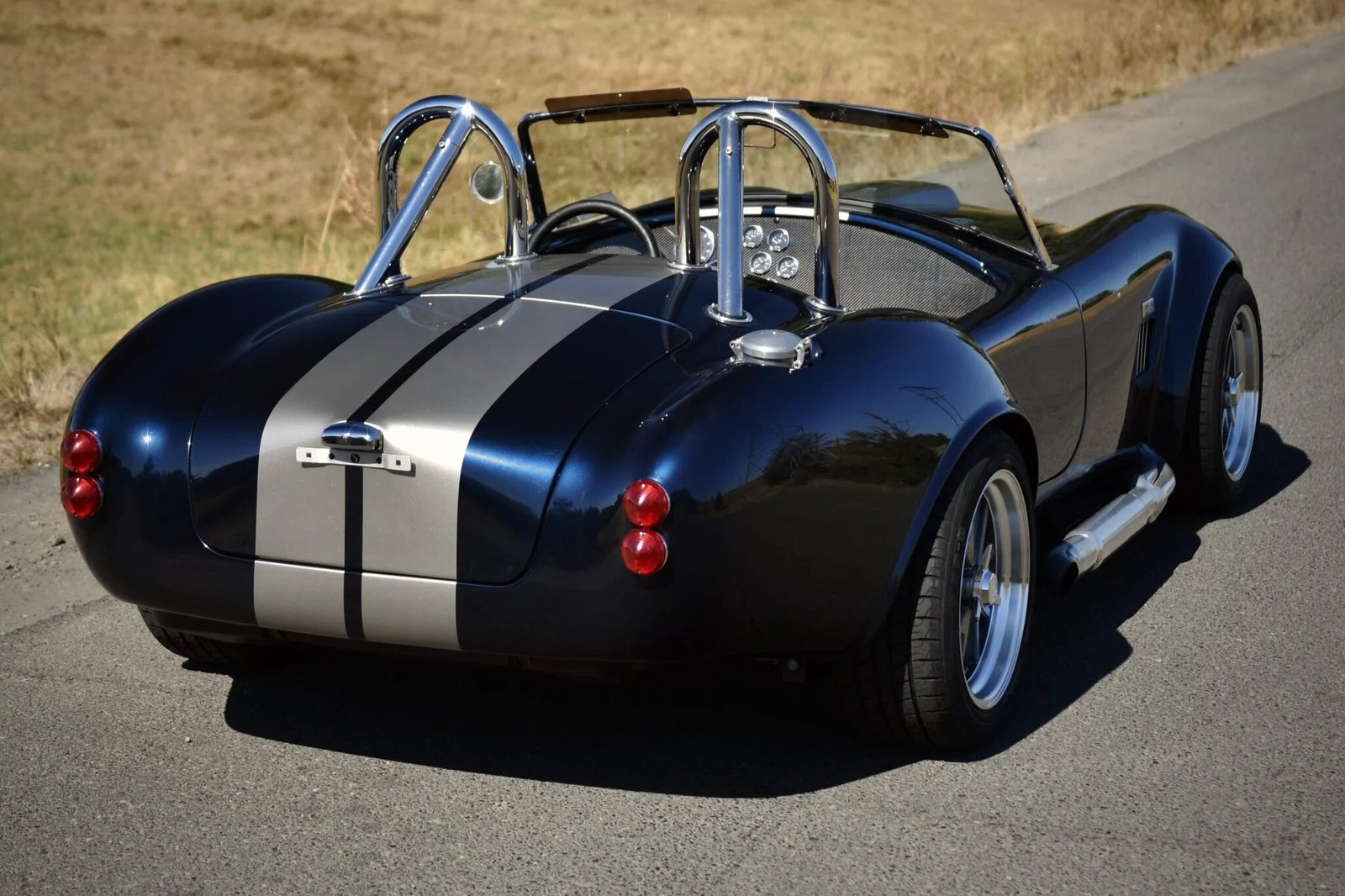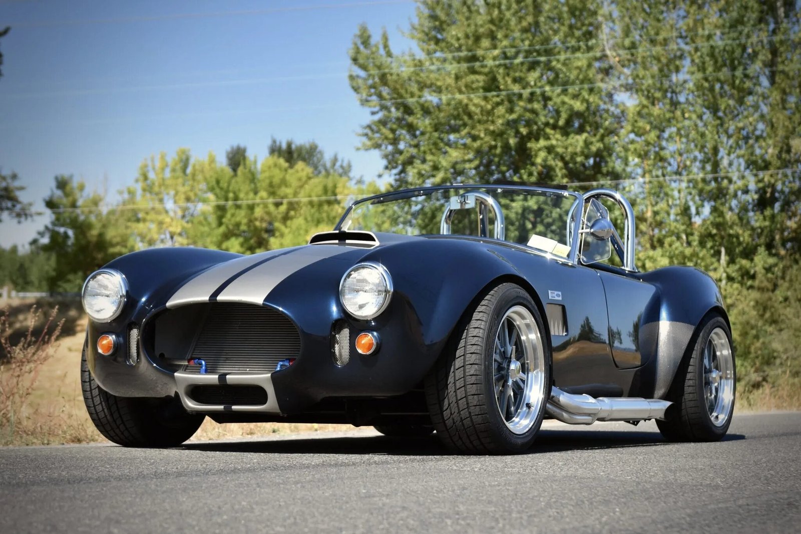 This Factory Five Racing Mk3 Roadster is a Cobra replica that is finished in blue with silver stripes over a black interior and is powered by a 351ci V8 mated to a five-speed manual transmission.