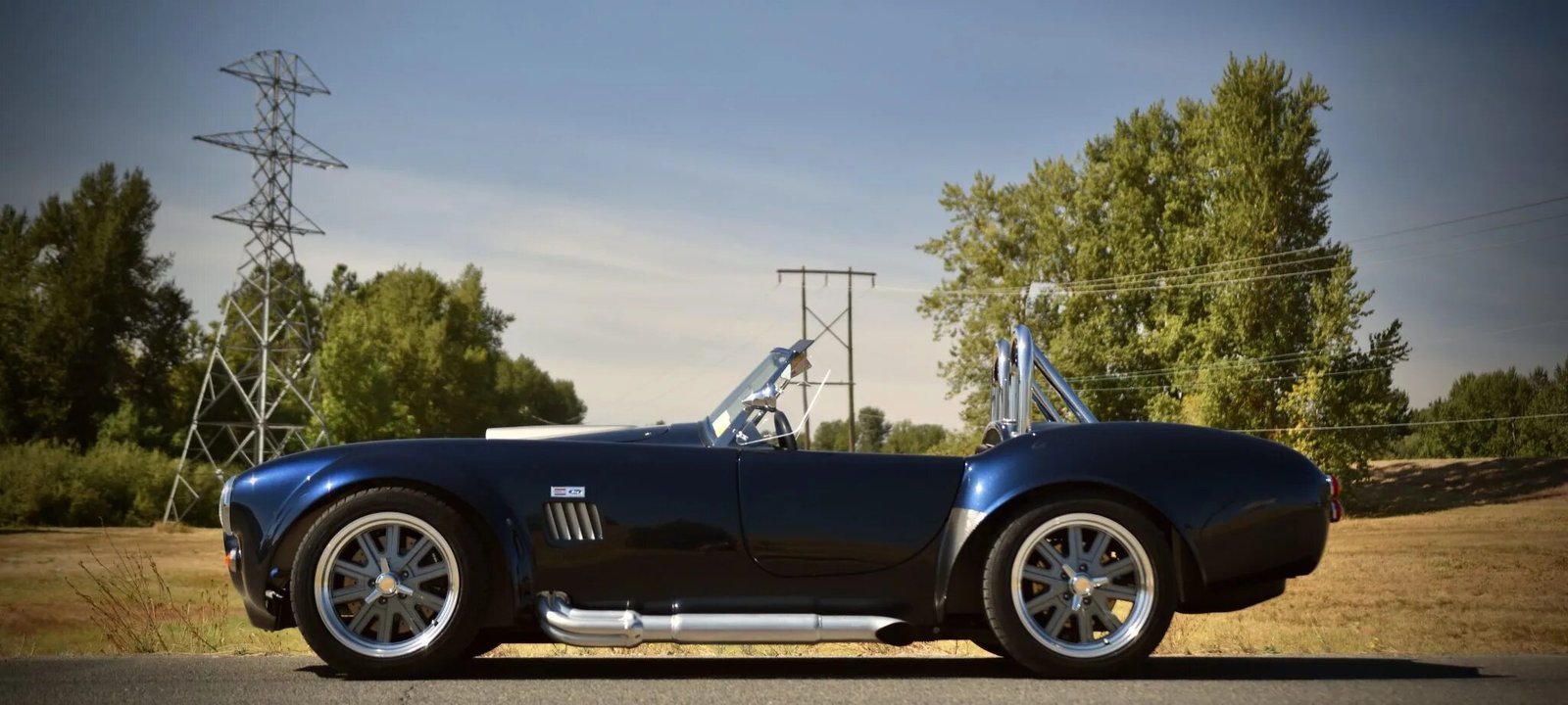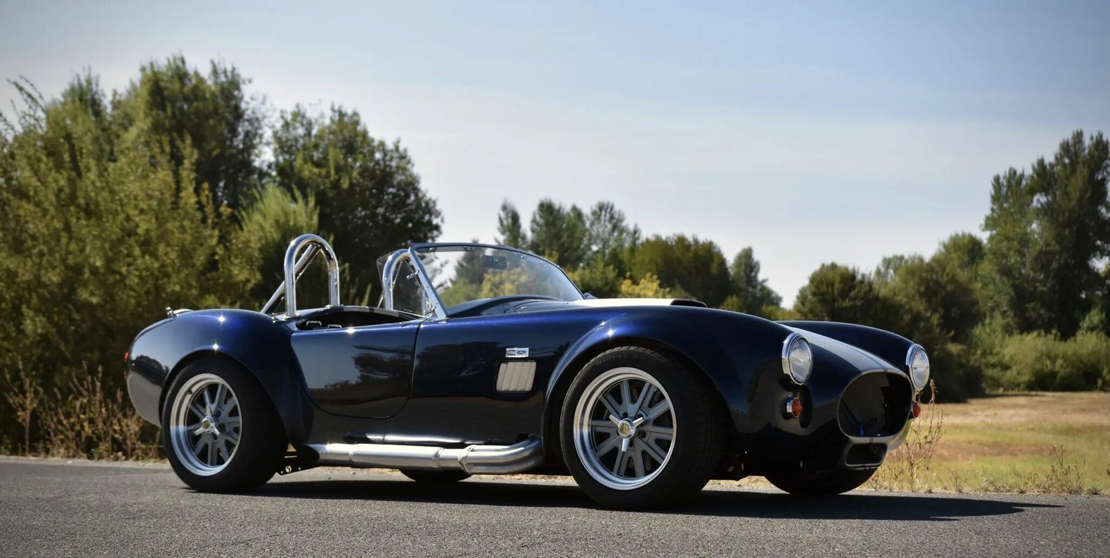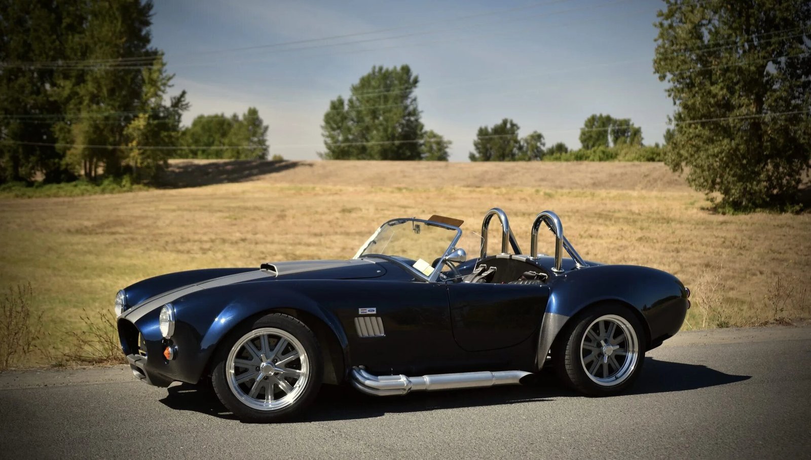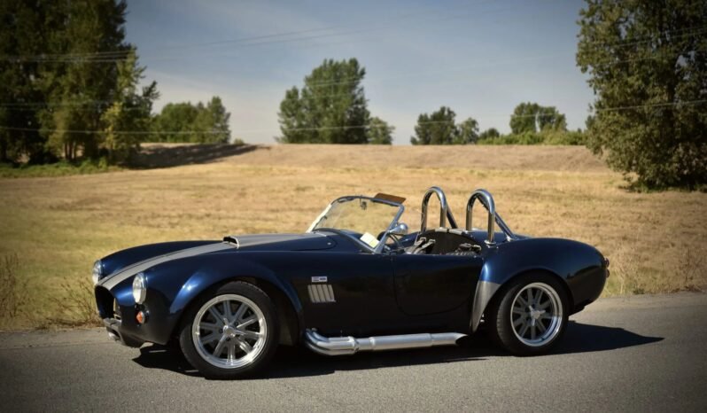 This Factory Five Racing Mk3 Roadster is a Cobra replica that is finished in blue with silver stripes over a black interior and is powered by a 351ci V8 mated to a five-speed manual transmission.