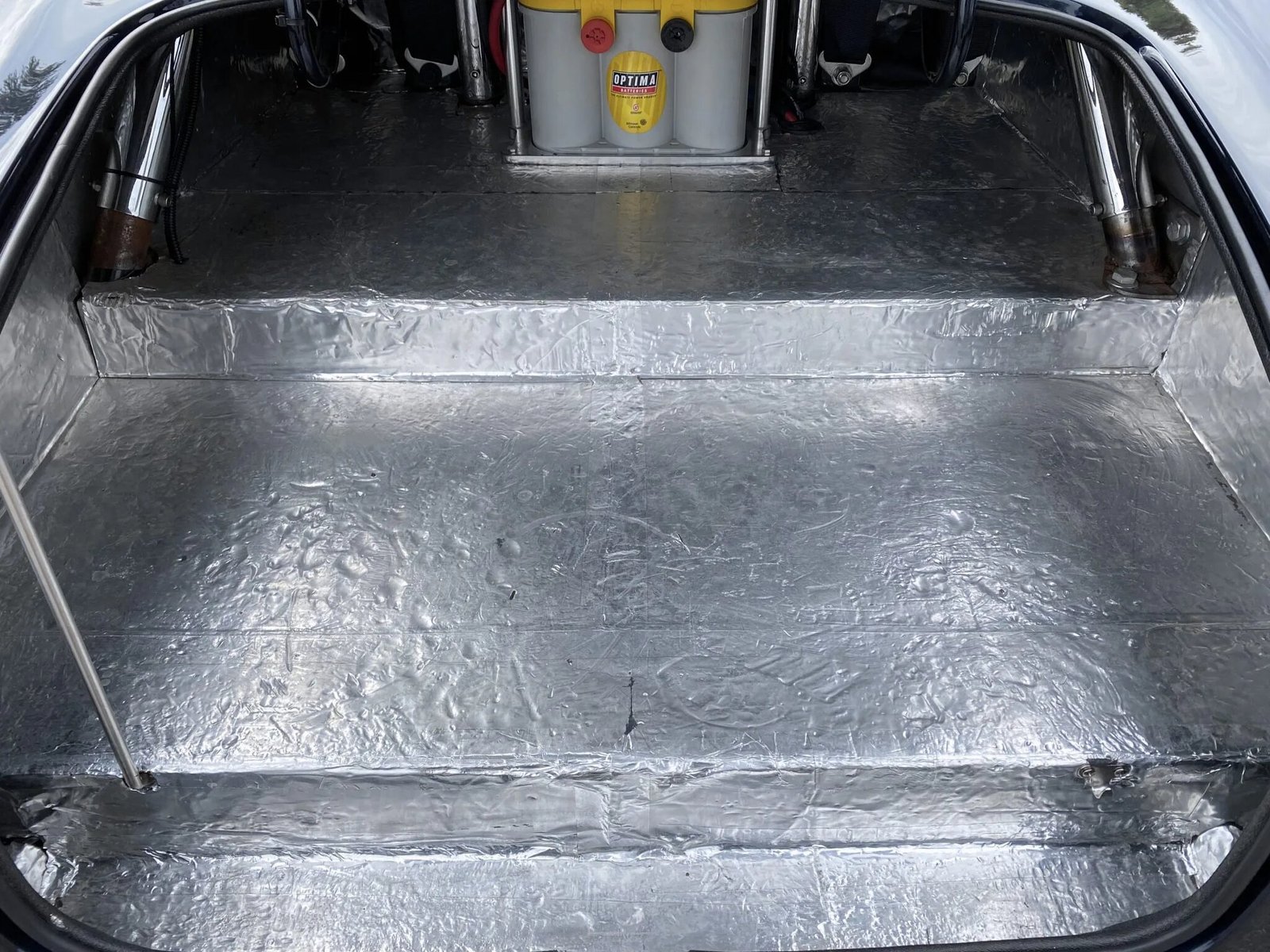 A fire extinguisher with a chrome-plated canister is mounted on the transmission tunnel beneath the dashboard.