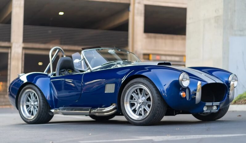 This Factory Five Racing Mk4 Roadster is a Shelby Cobra replica, the car is finished in blue over black leather upholstery and powered by a 5.0-liter Coyote V8 mated to a five-speed manual transmission. Equipment includes a black soft top, 17″ Halibrand-style wheels, Koni adjustable coilovers, side-exit exhaust pipes, dual roll hoops, wind wings, power-assisted Wilwood disc brakes, power steering, heated seats, and Schroth racing harnesses.