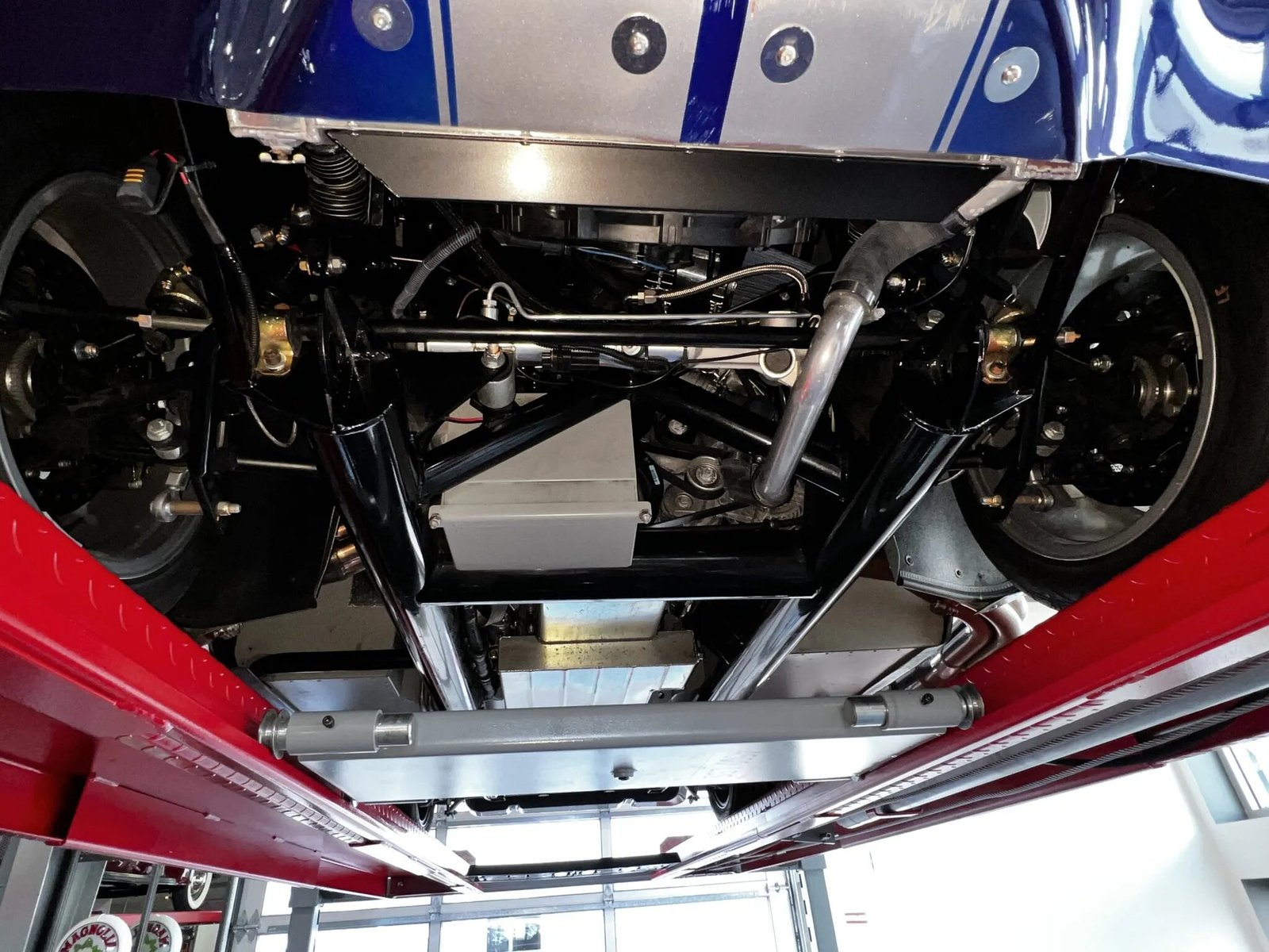 The 5.0-liter Coyote V8 was ordered new as a crate engine through Factory Five AT and is equipped with a Moroso oil pan and coolant expansion tank. The radiator is equipped with a shroud to direct airflow along with a variable-speed radiator fan controller with a bypass switch. The engine was tuned by Drive Autosports in May 2020. Power is sent to the rear wheels through a Tremec TKO600 five-speed manual transmission that was supplied by Factory Five AT. The steel tube chassis is powder-coated black.
