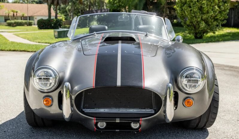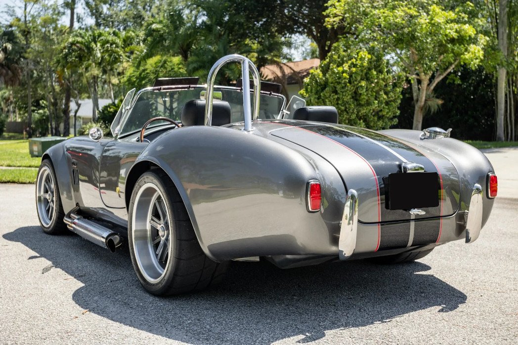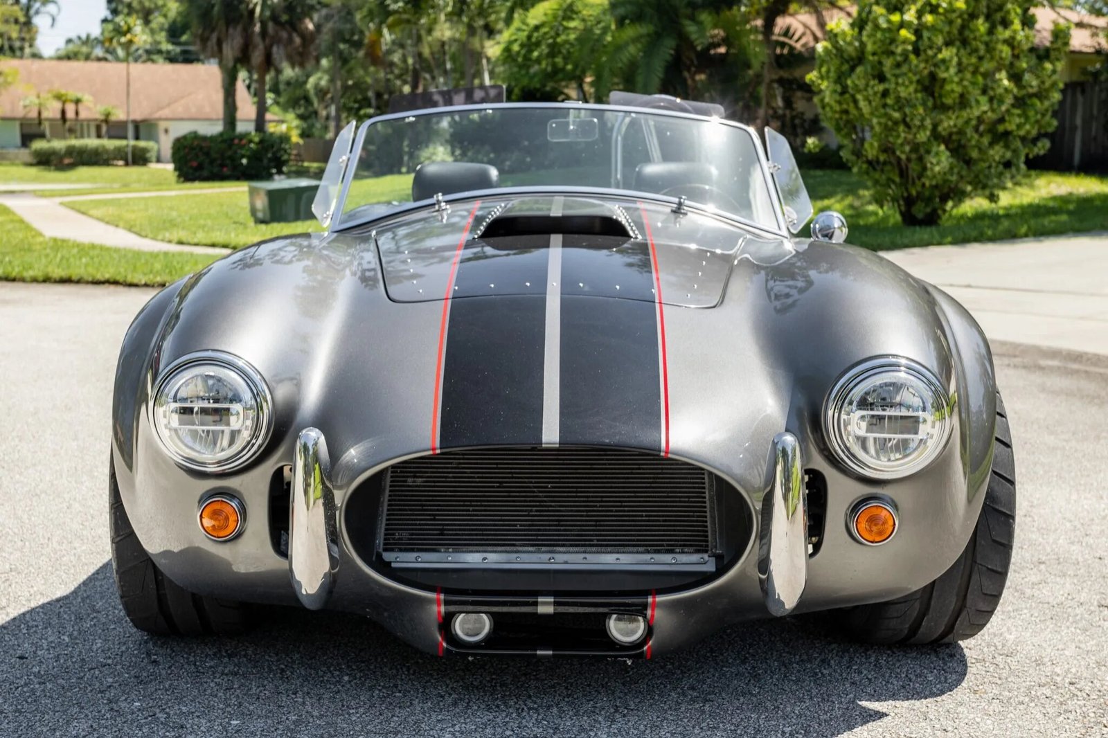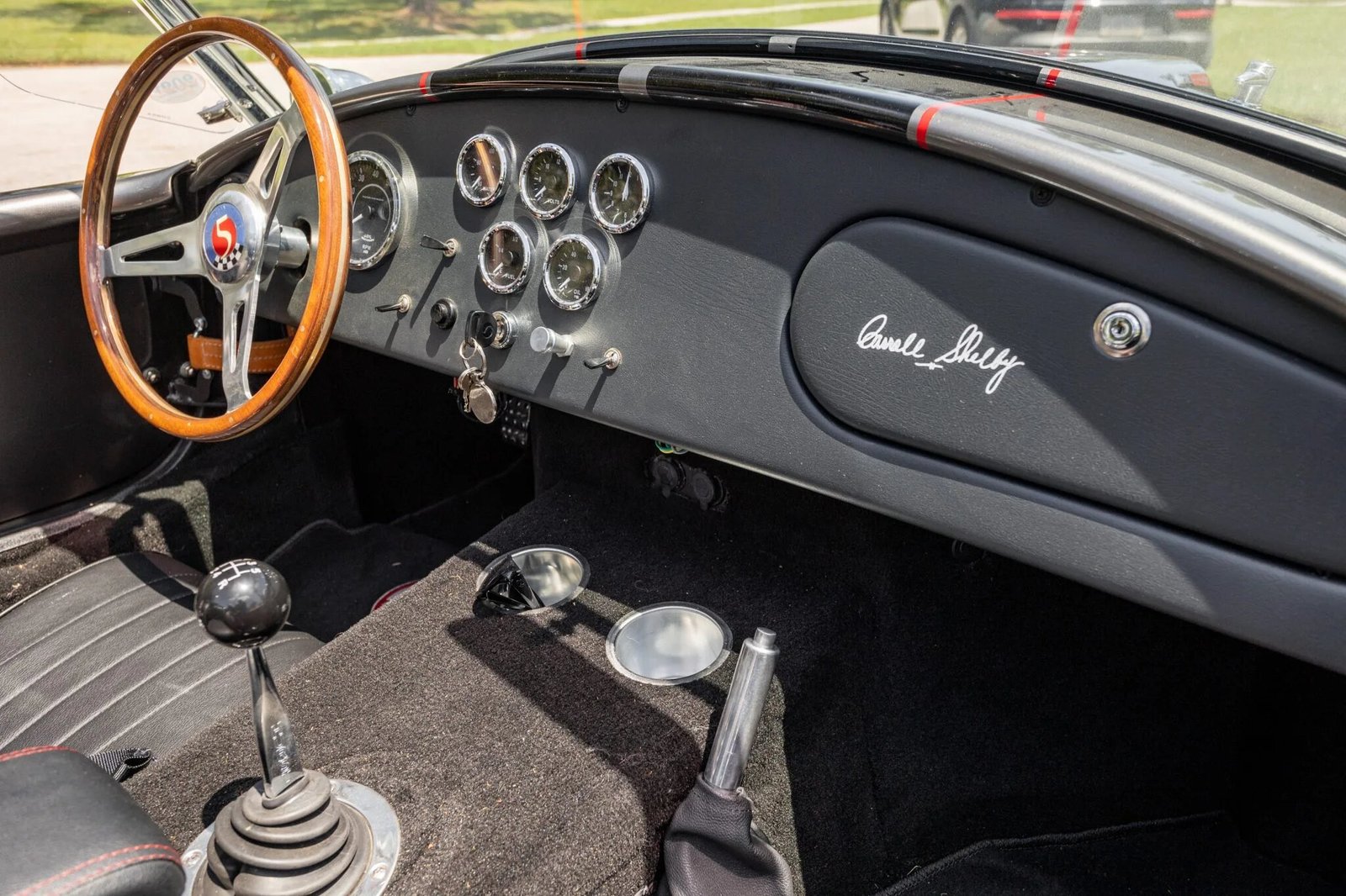 A fire extinguisher is mounted between the seats, and additional features include cupholders, body-color door panels, a Hurst shifter, black carpeting, Cobra-branded floor mats, an armrest center console, an aluminum pedal set, and a lockable glovebox showing a manufactured Carroll Shelby signature.