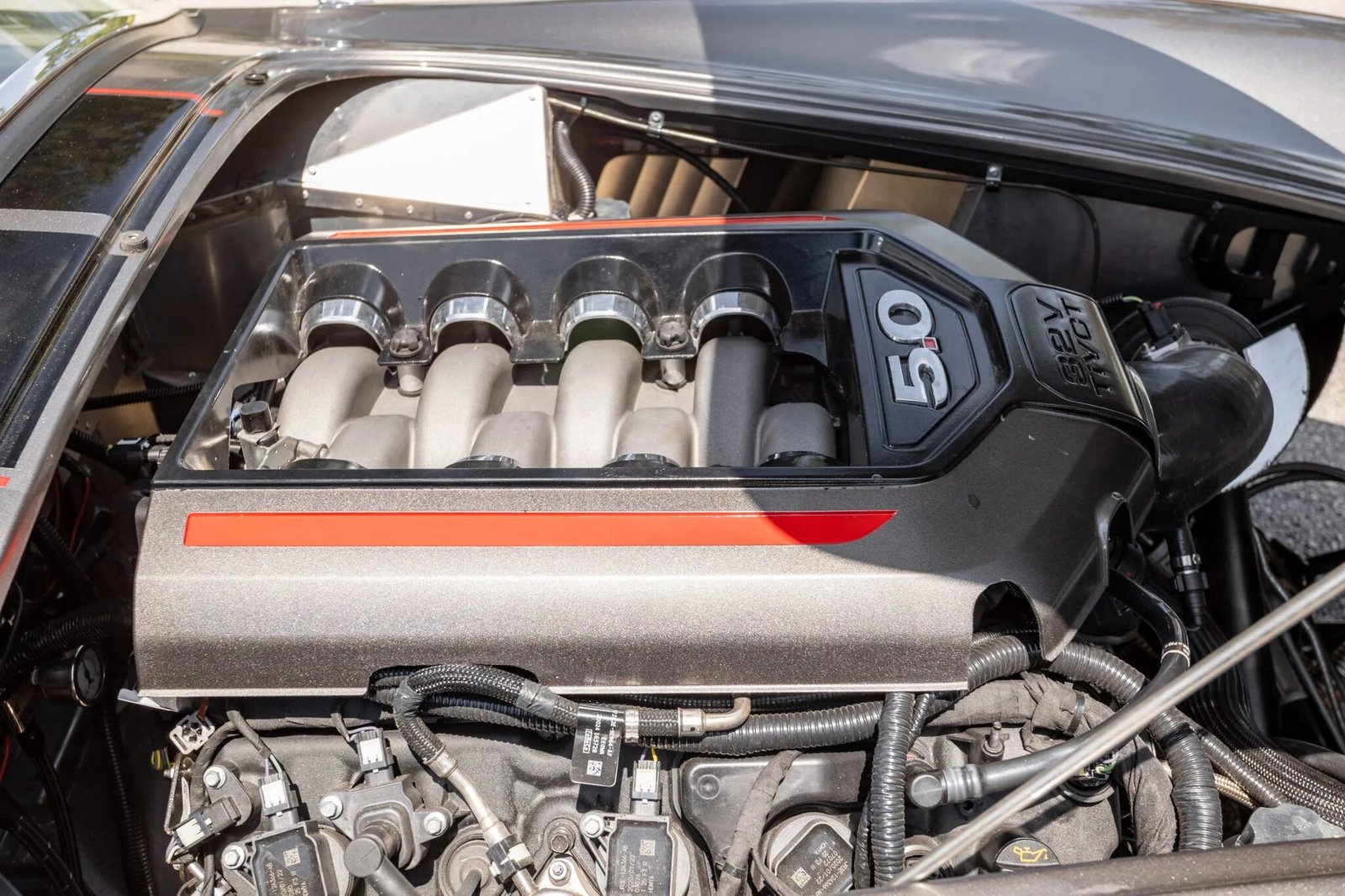 The Ford-derived third generation 5.0-liter Coyote V8 crate engine sends power to the rear wheels through a Tremec five-speed manual transmission.