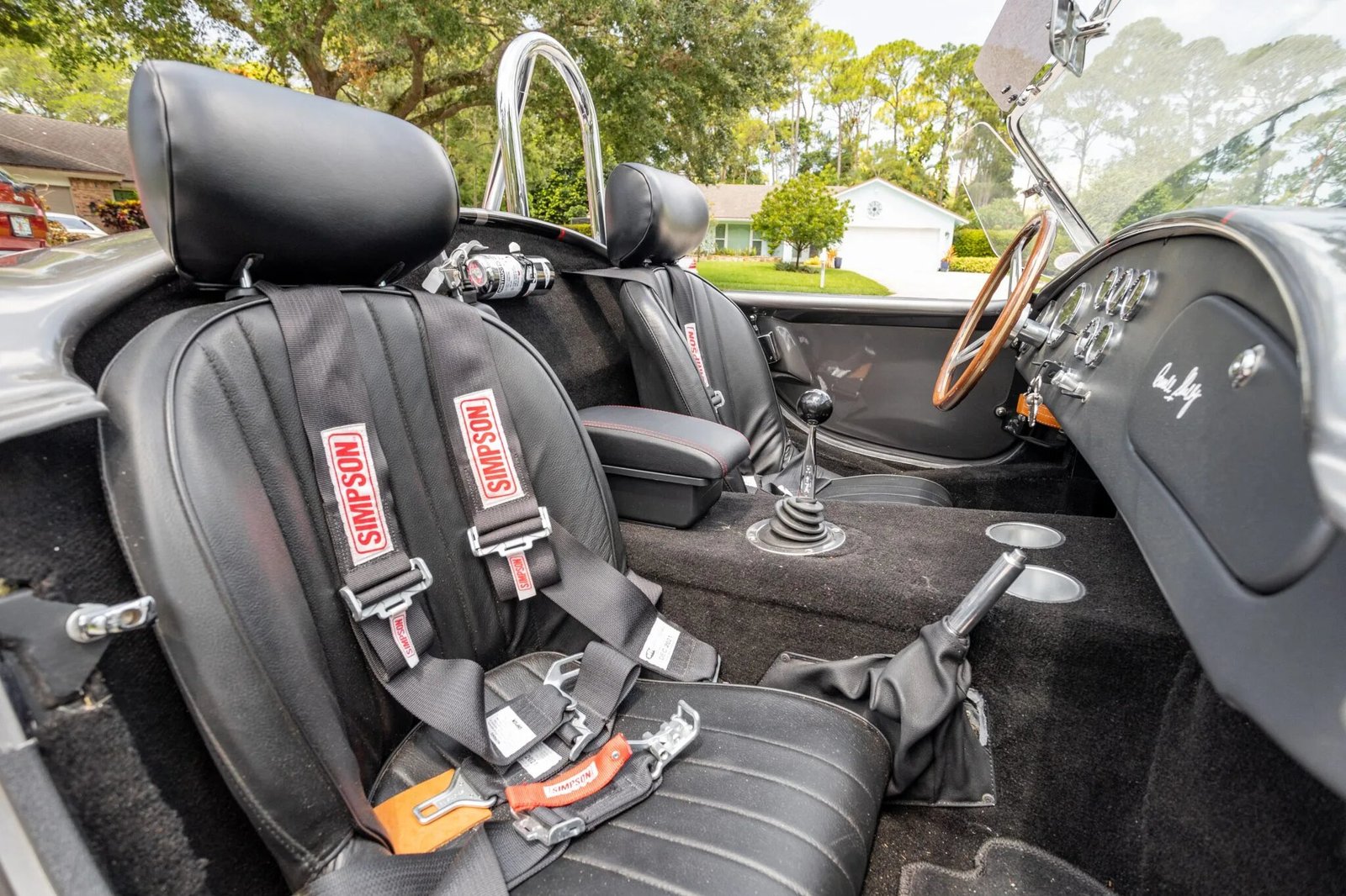 The interior features fixed-back bucket seats trimmed in black leather and equipped with headrests as well as Simpson four-point harnesses.