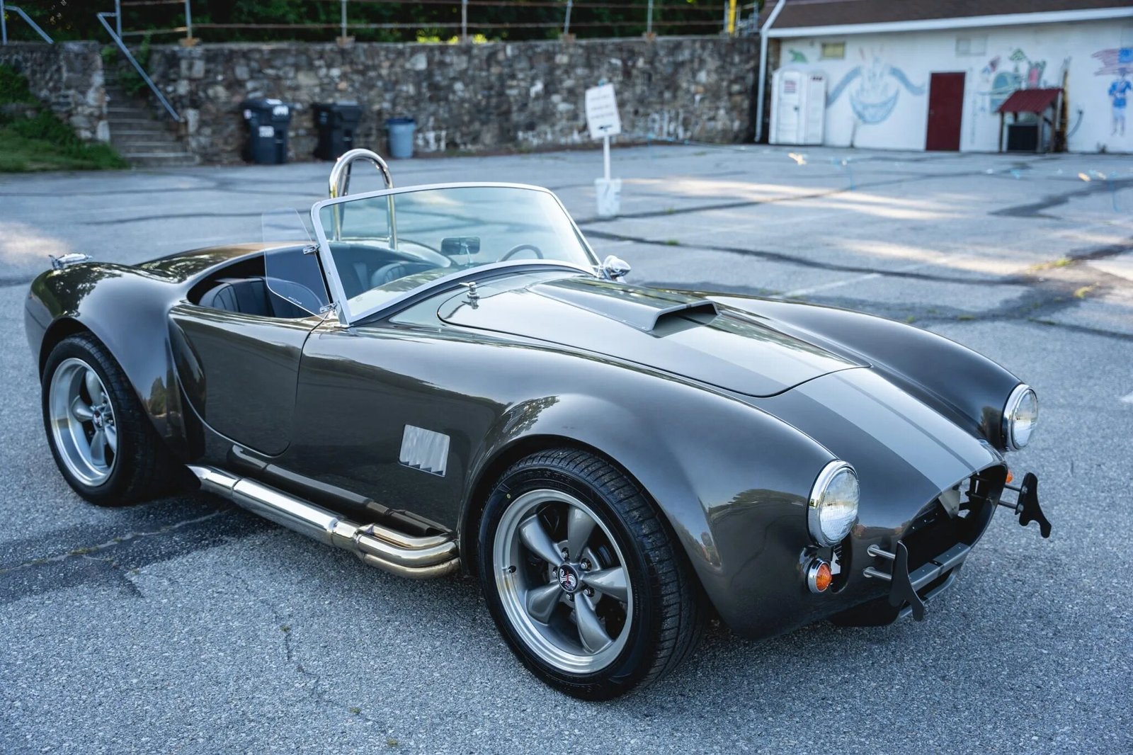 The fiberglass body is finished in dark gray with lighter gray stripes, and exterior features include a chrome roll hoop, a hood scoop, wind wings, polished side-exit exhaust pipes, Le Mans-style fuel filler, bullet-style left-side mirror, and quick-jack bumperettes.