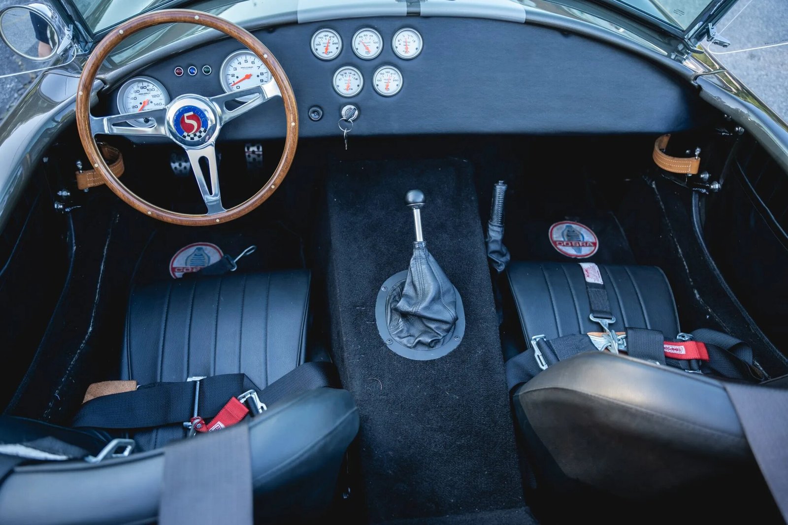 Features include Simpson harnesses, a dash-mounted rearview mirror, Cobra-branded floor mats, and map pockets in both doors.