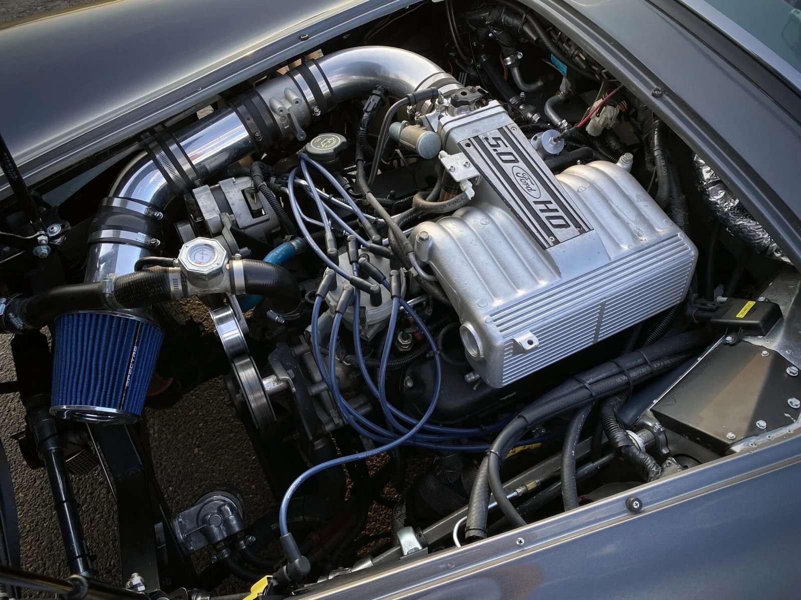 The 5.0-liter V8 was rebuilt and fitted with a GT40 intake manifold and cylinder heads, 24lb fuel injectors, full roller rockers, and replacement rod bearings, piston rings, lifters, and pushrods.