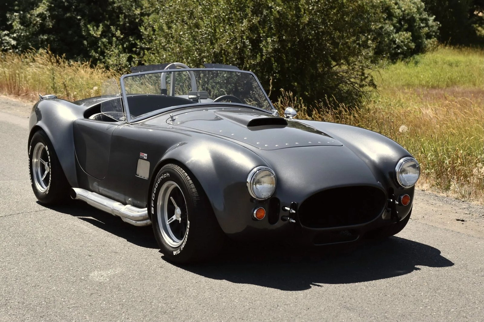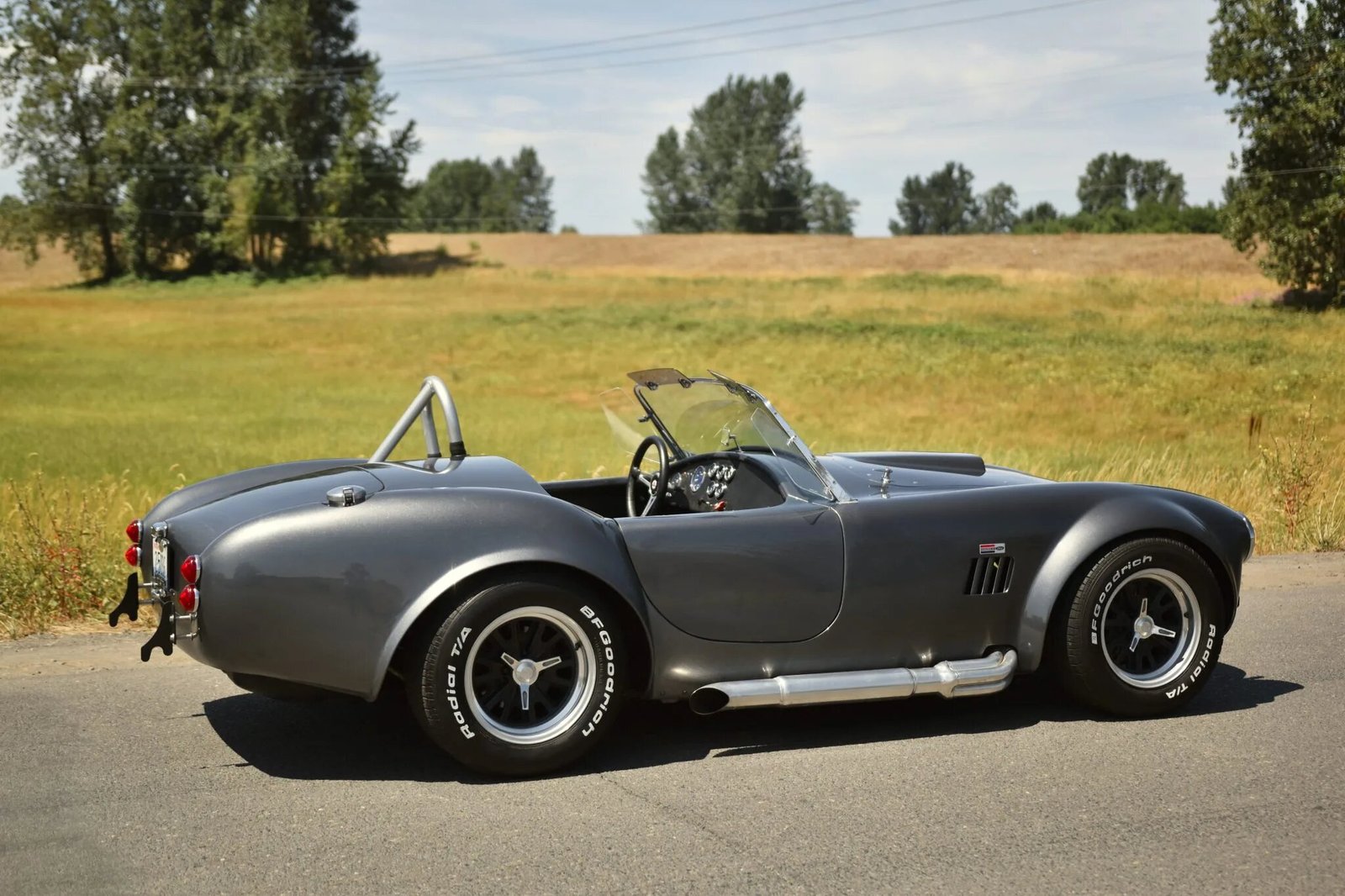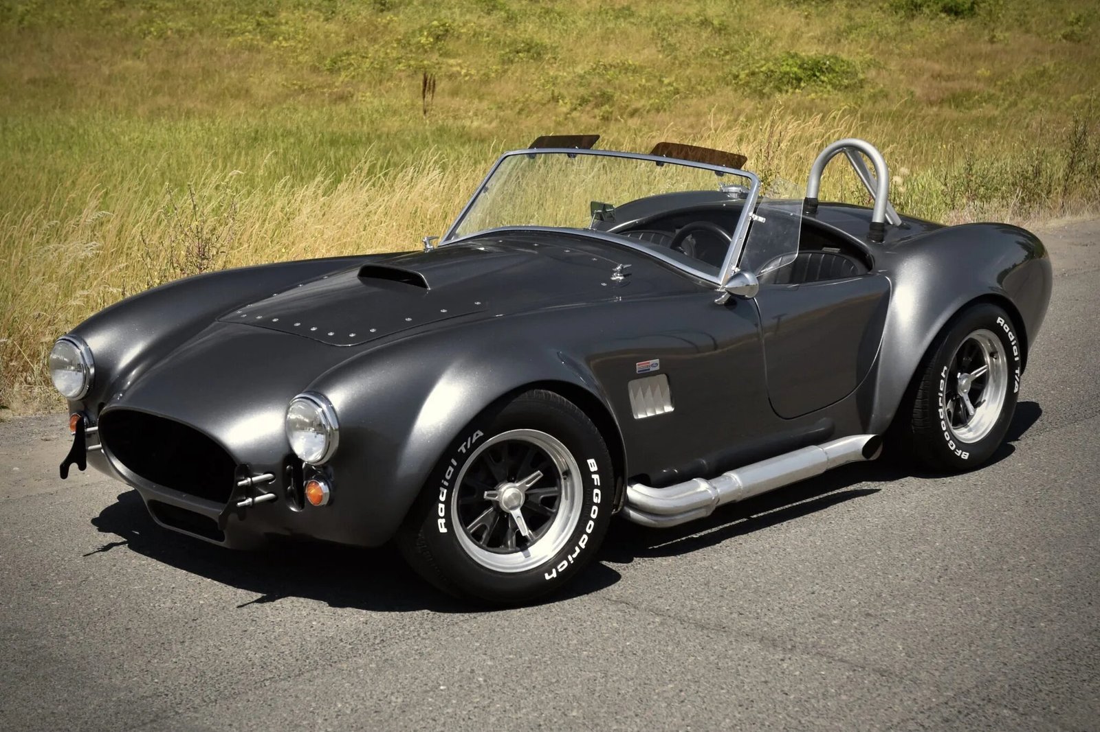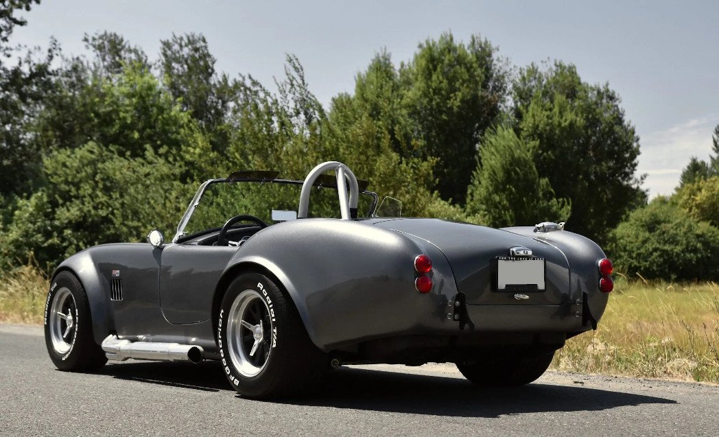 This Factory Five Racing Mk2 Roadster is a Shelby Cobra replica finished in gray over black upholstery and is powered by a 5.0-liter V8 paired with a five-speed manual transmission.