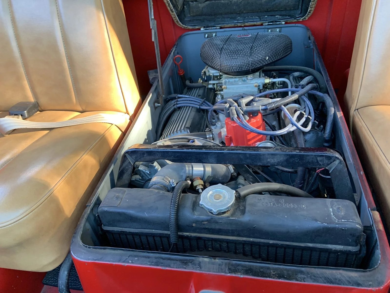 The seats and engine cover have been re-covered in tan upholstery and matching outer armrests are fitted to both doors. The floors are covered in black rubber and matching black floor mats.
