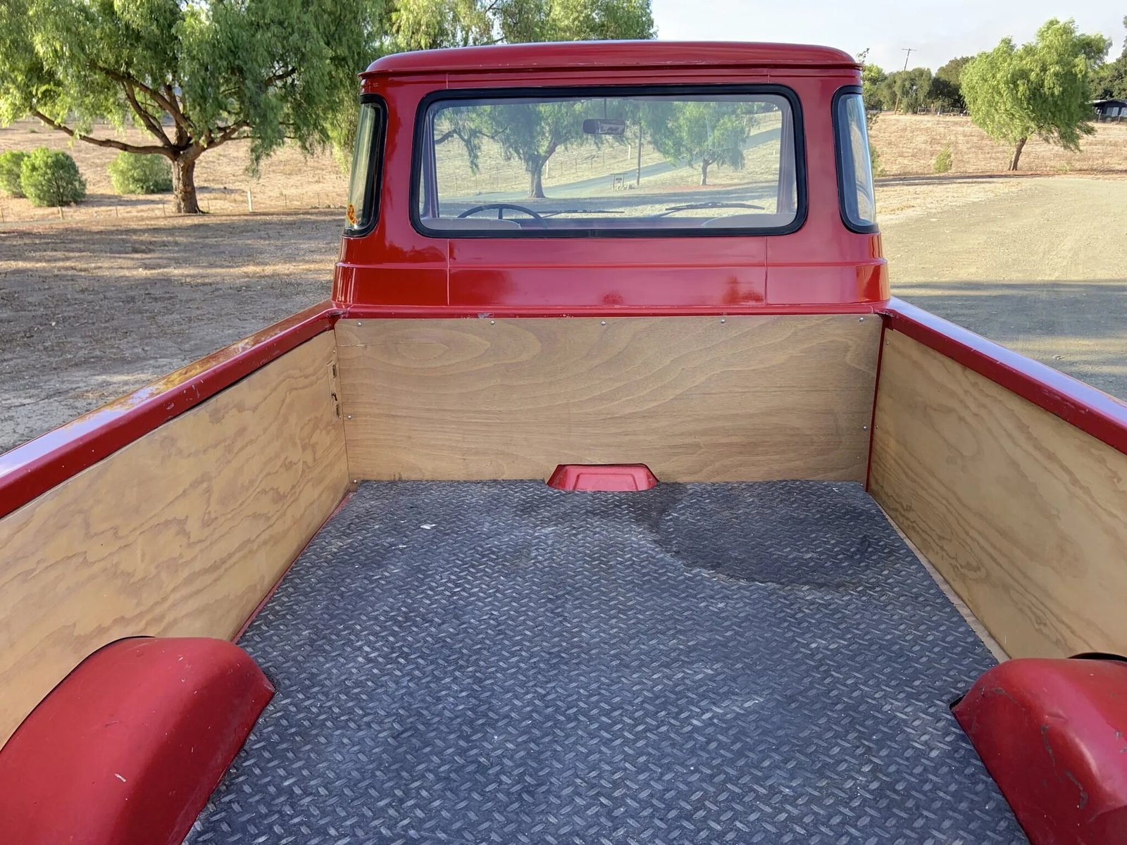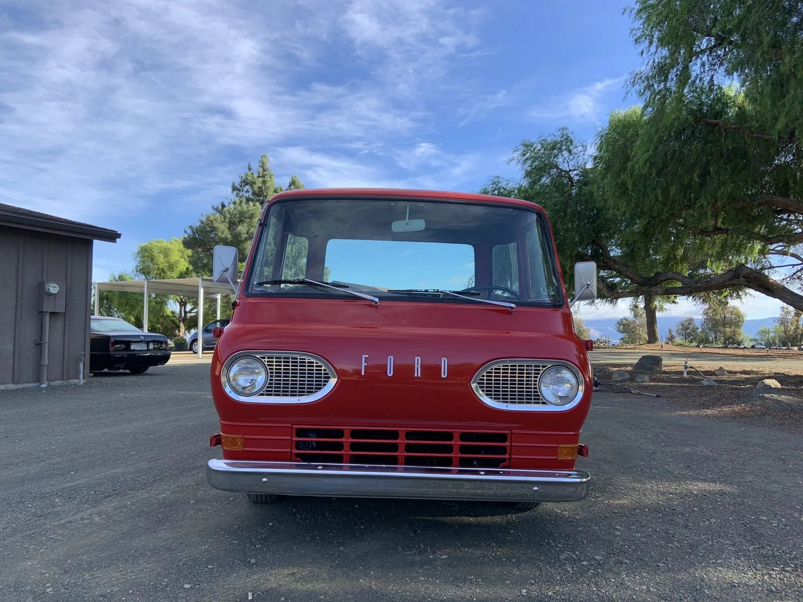 A black Econoline steering wheel fronts a column shift lever and a red-painted metal dashboard.