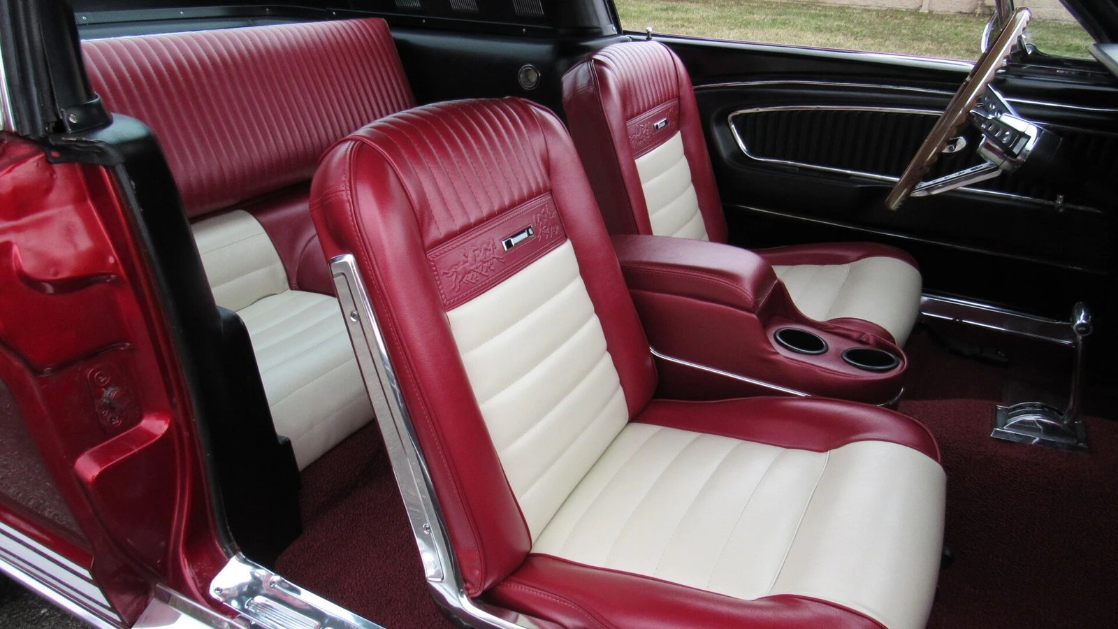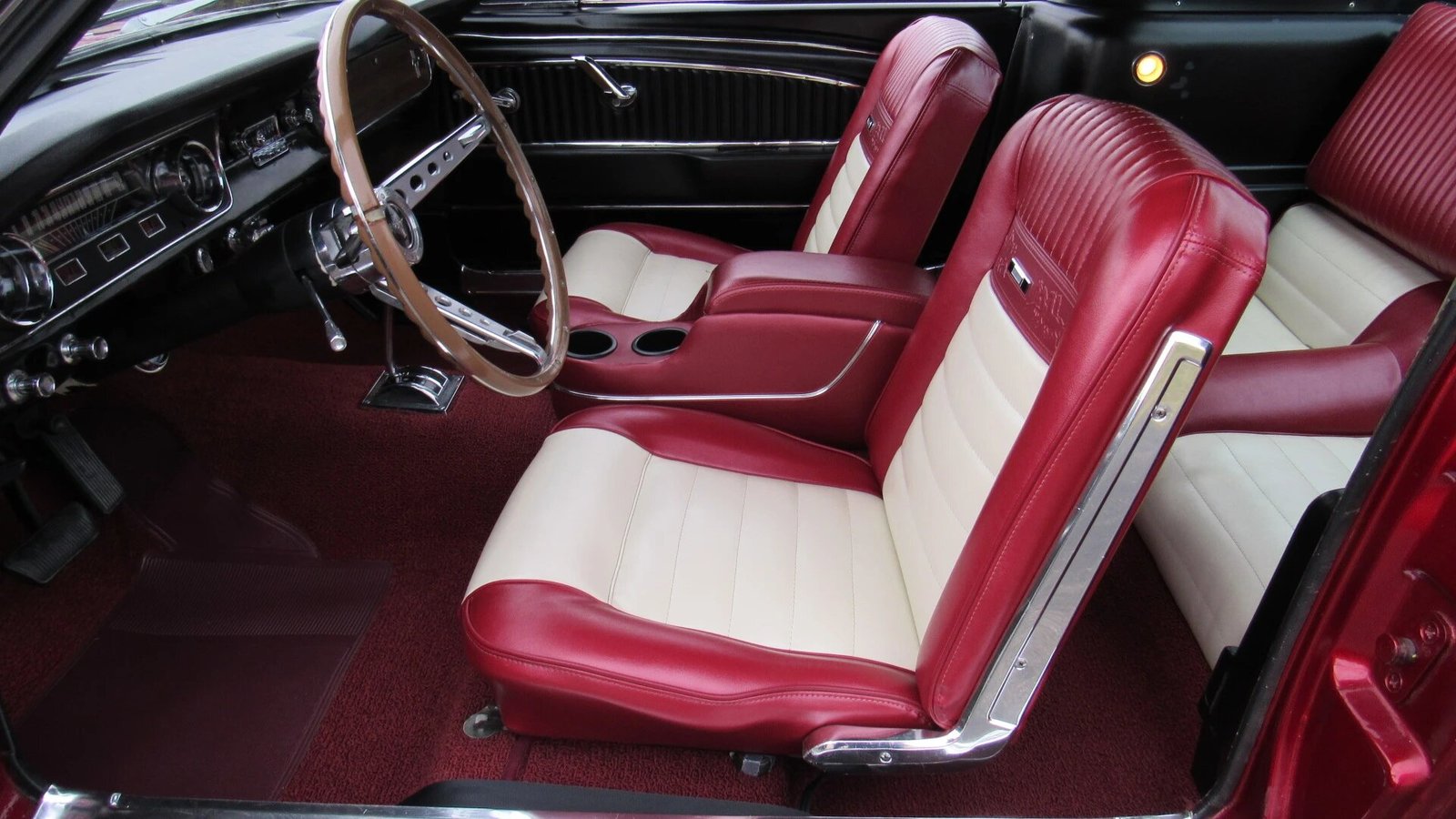 The cabin features front buckets and a rear bench upholstered in red vinyl with parchment inserts and is joined by a black dashboard and trim panels along with new red carpets.
