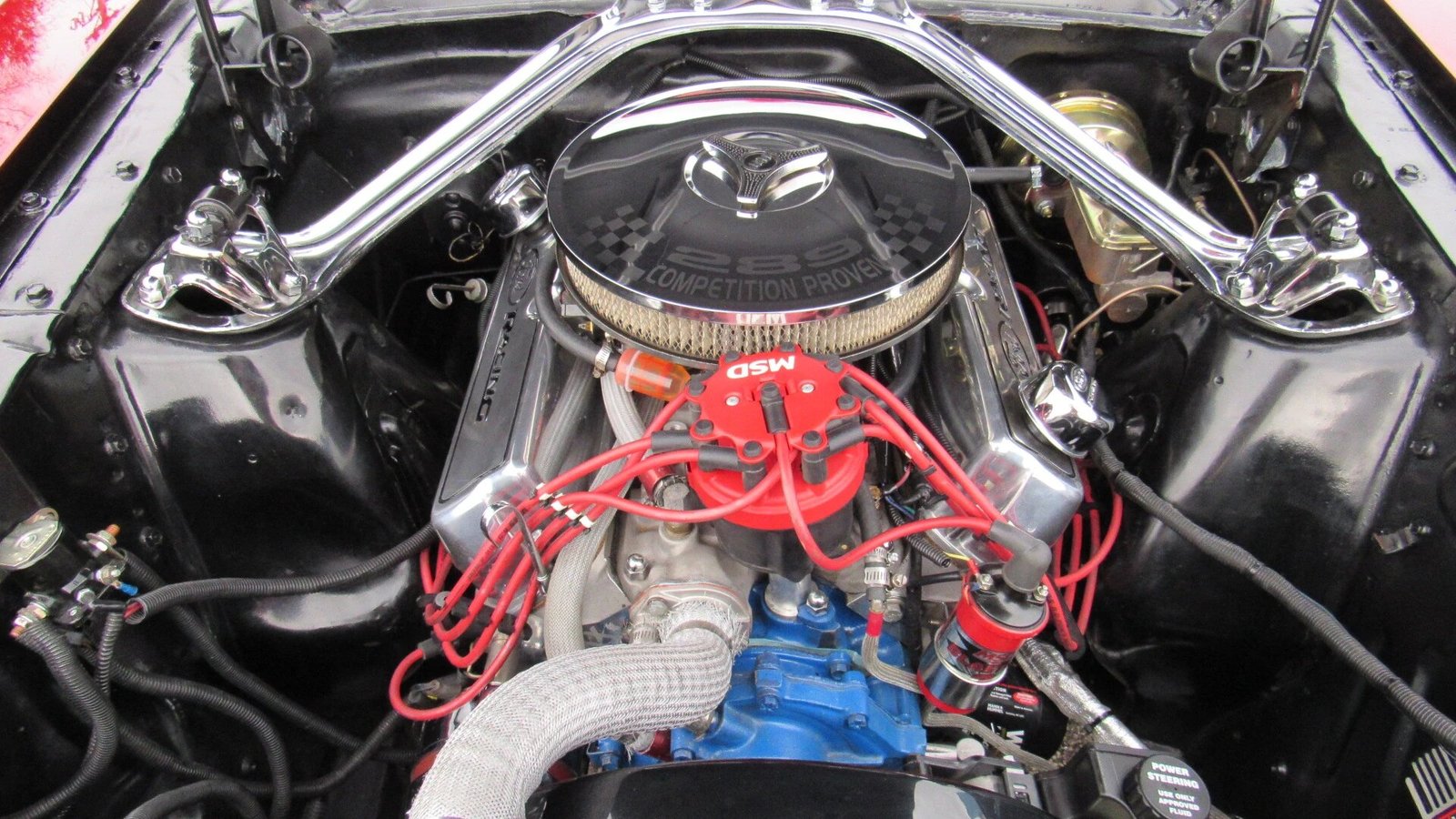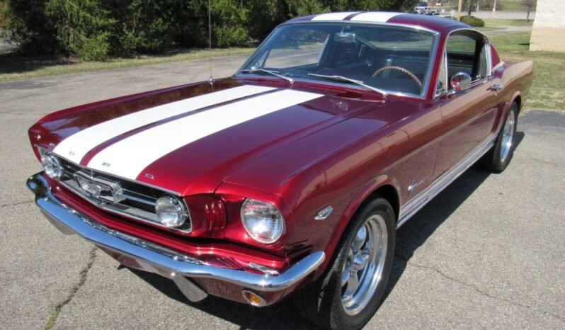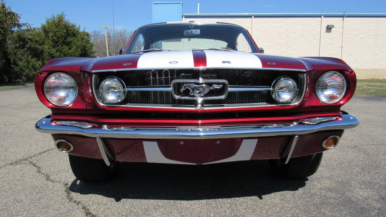 This 1965 Ford Mustang fastback is finished in red with white stripes over red and white vinyl upholstery and is powered by a rebuilt 289ci V8 mated to a three-speed automatic transmission.