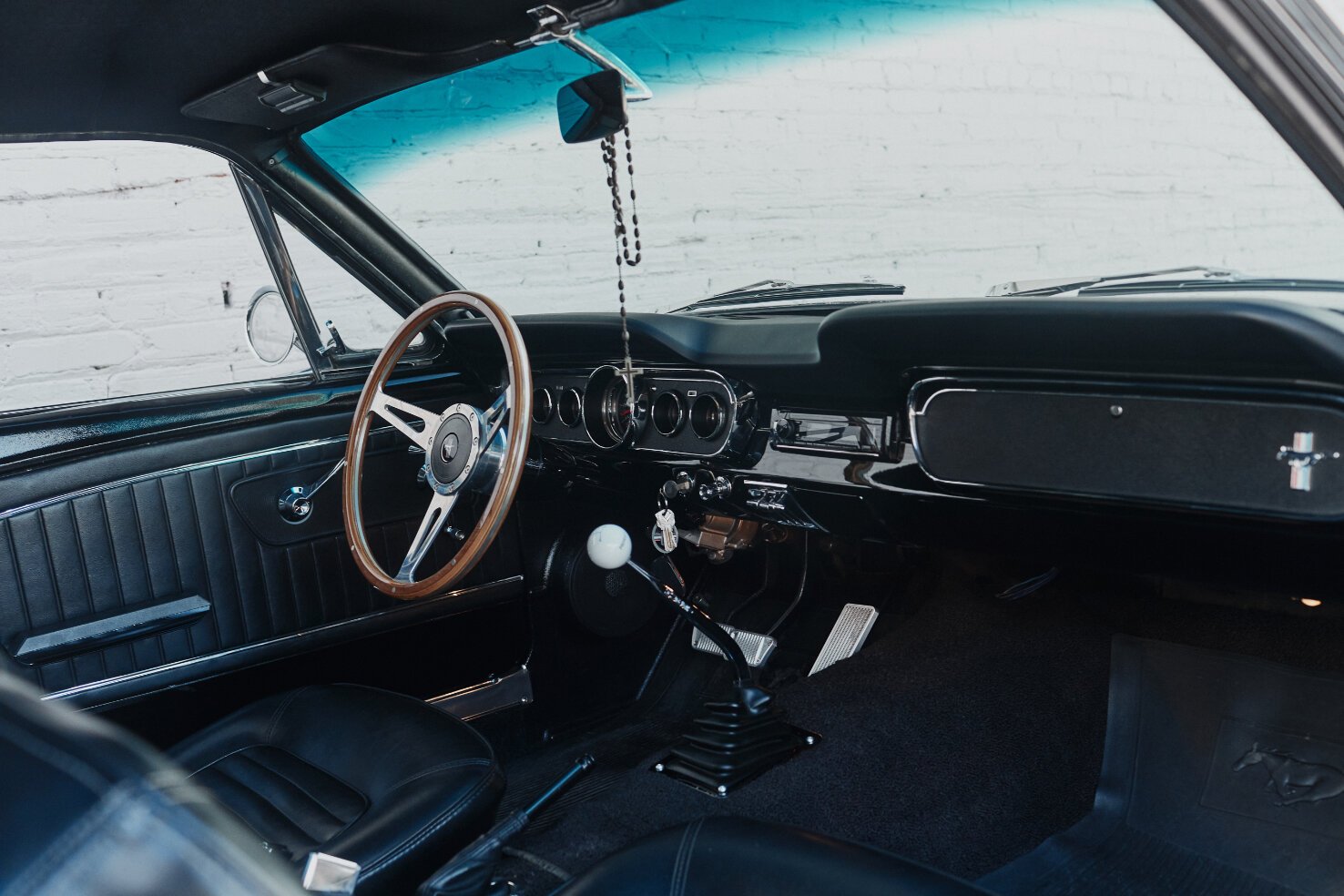 A wood-rimmed steering wheel sits ahead of a GT-style gauge panel with AutoMeter instrumentation that includes a 120-mph speedometer, an inset 8k-rpm tachometer, and four auxiliary gauges.