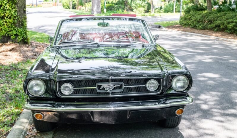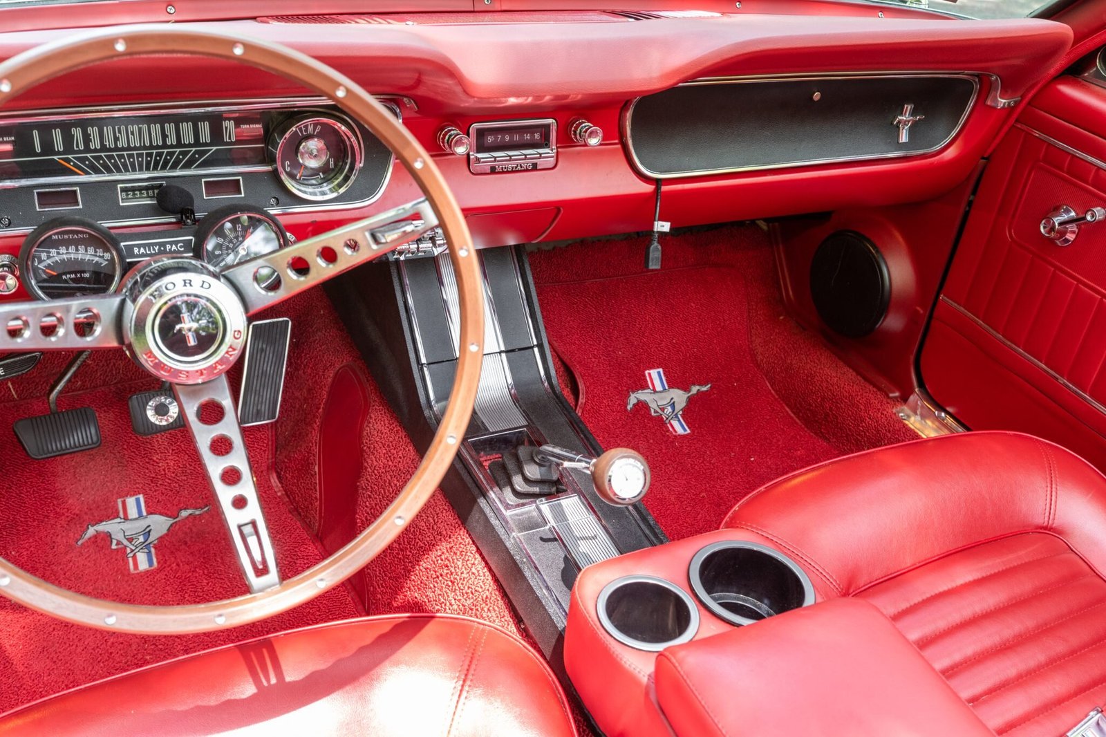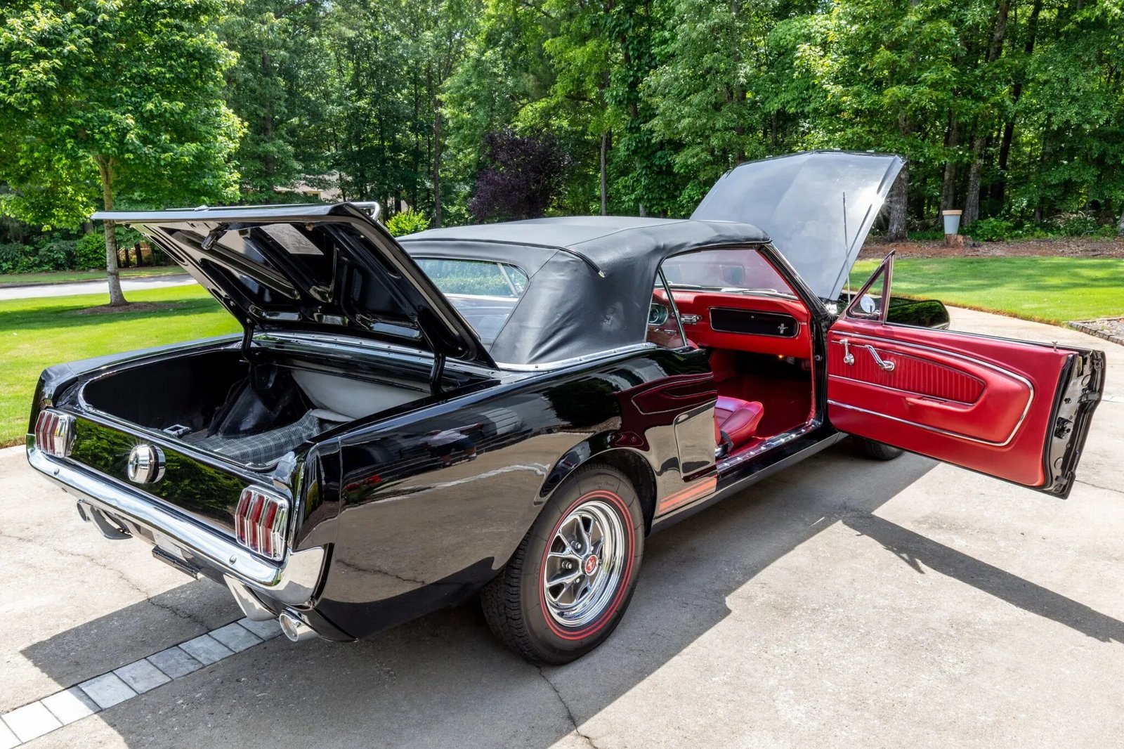 This 1965 Ford Mustang convertible is finished in black over red and powered by a replacement 289ci V8 paired with a Toploader four-speed manual transmission.