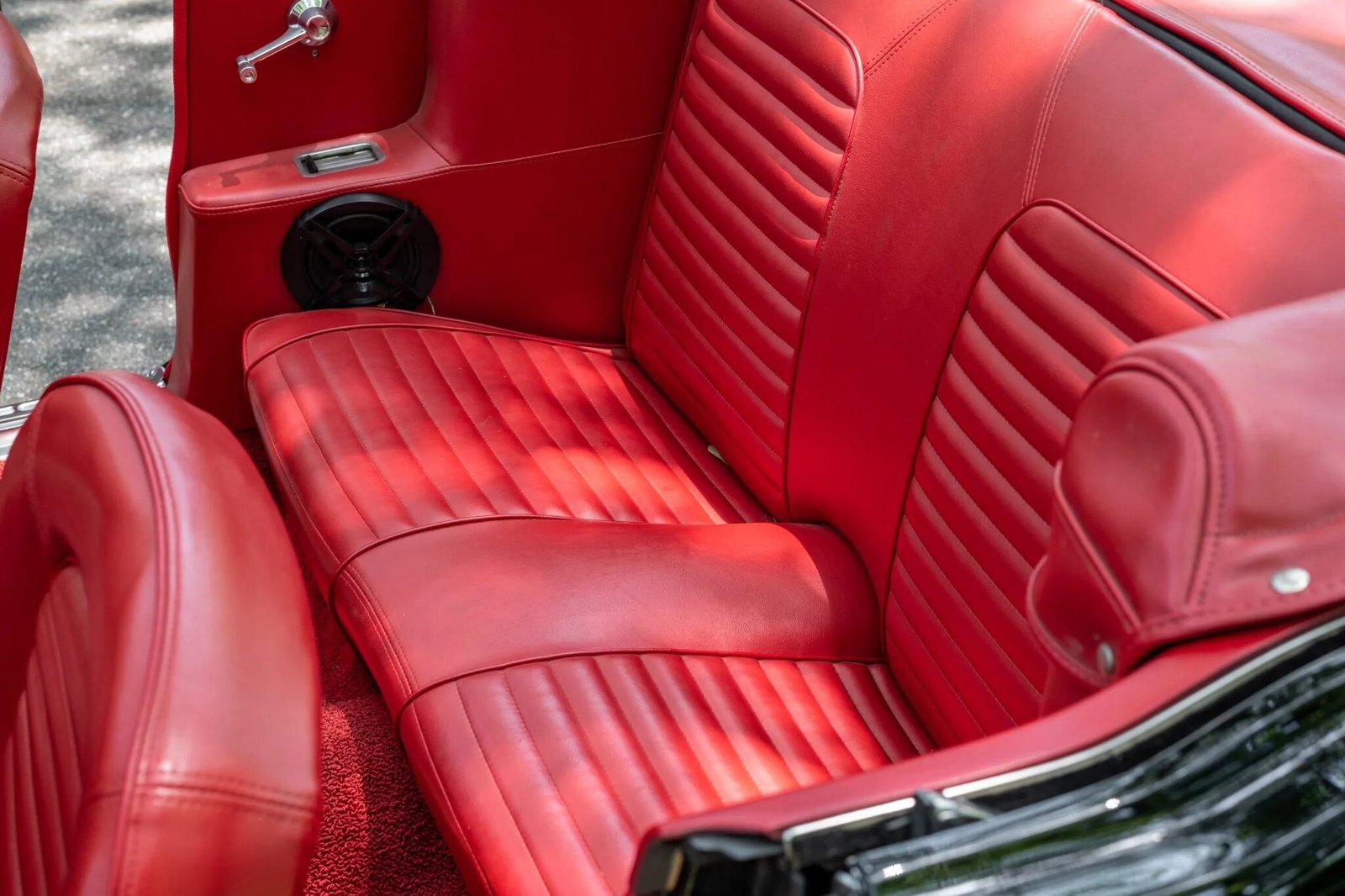 The cabin features front bucket seats and a rear bench upholstered in red vinyl joined by a matching dashboard, door panels, and carpets.