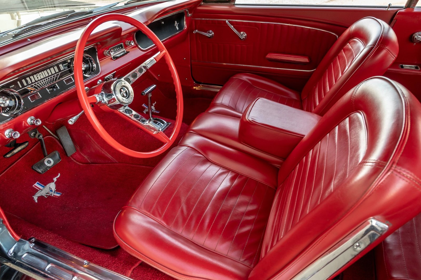 The optional front bench seat features a factory center armrest and is upholstered in red vinyl.