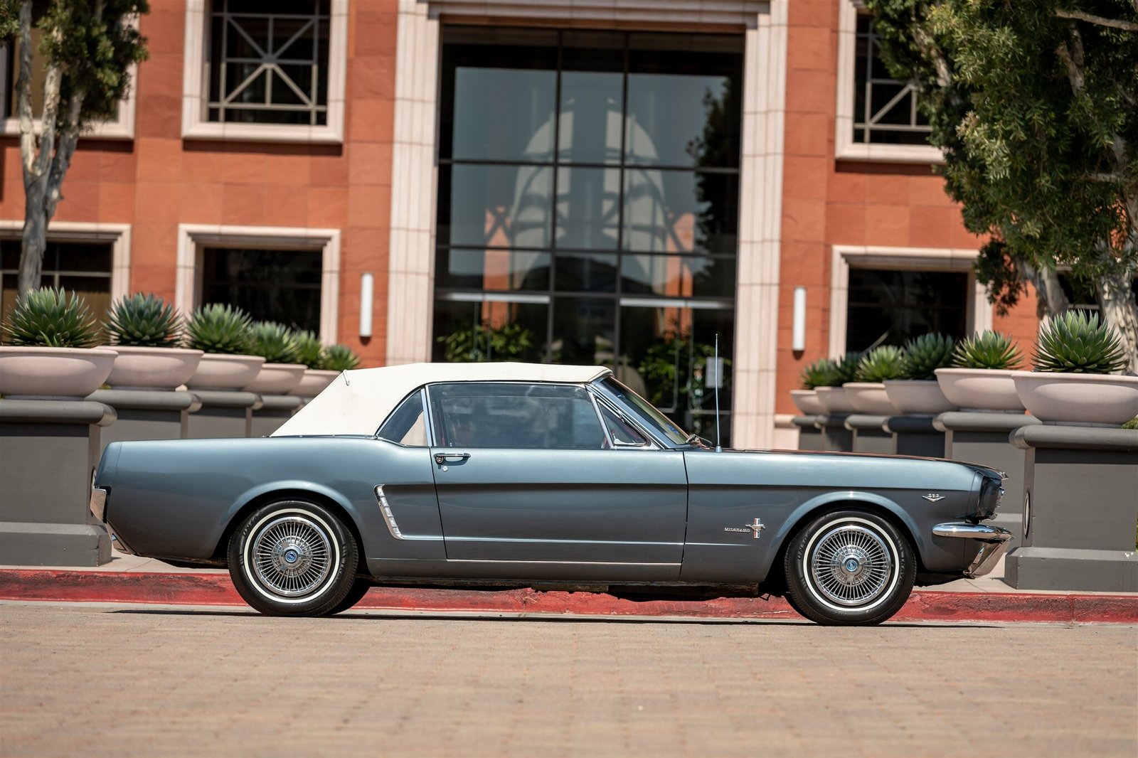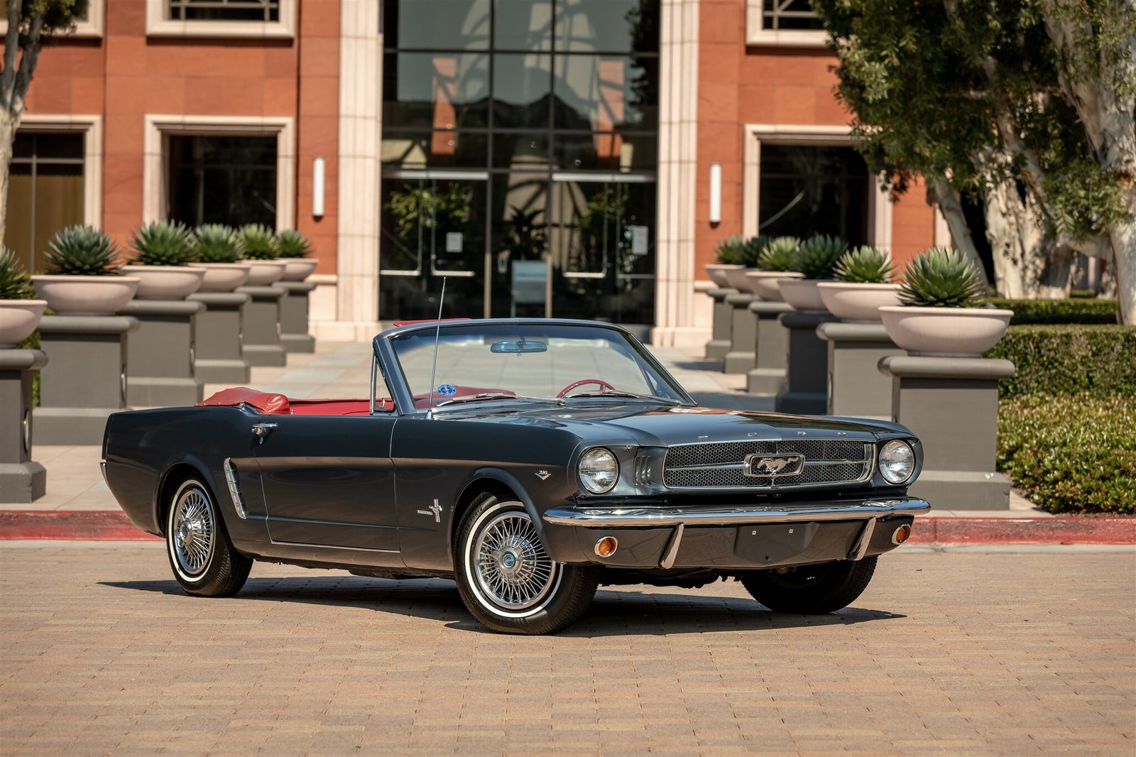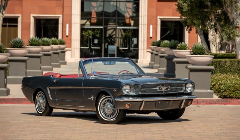 This 1965 Ford Mustang was built as a C-code convertible at Ford’s Dearborn, Michigan, facility with special-ordered paint and has been refinished in Charcoal Gray Metallic with a white convertible top over a red vinyl interior.