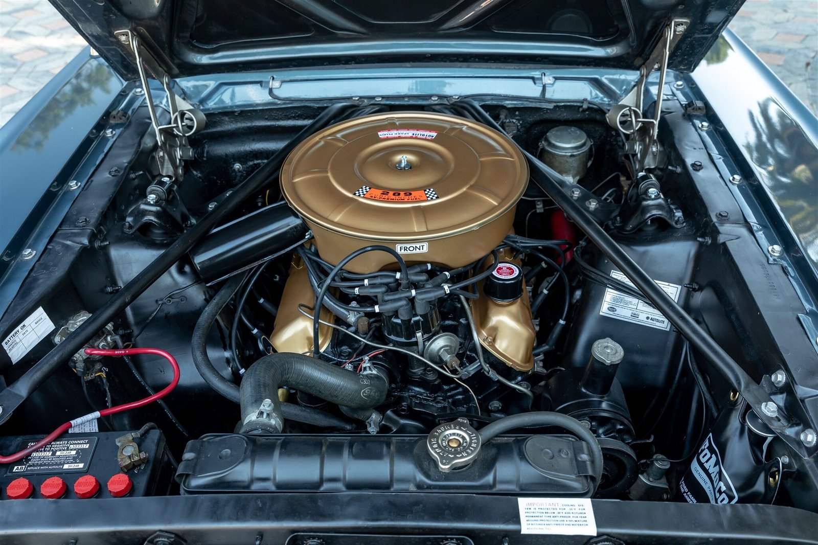 The 289ci C-code V8 is equipped with a two-barrel carburetor and was factory rated at 200 horsepower at 4,400 rpm and 282 lb-ft of torque at 2,400 rpm when new.