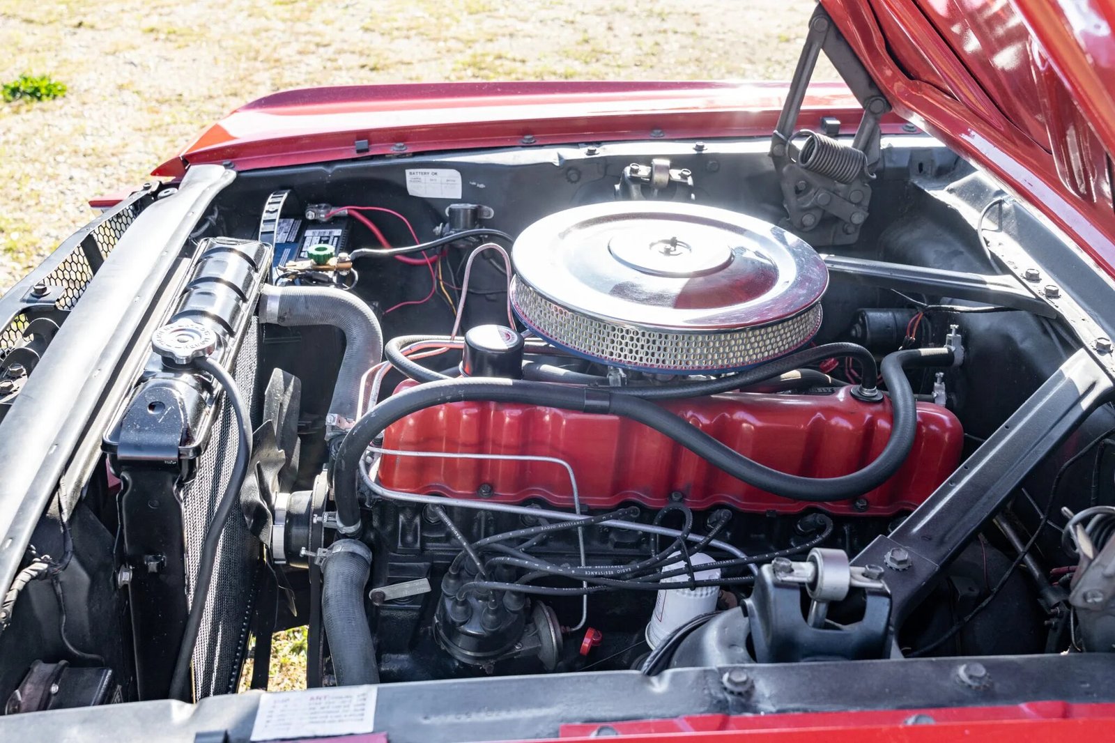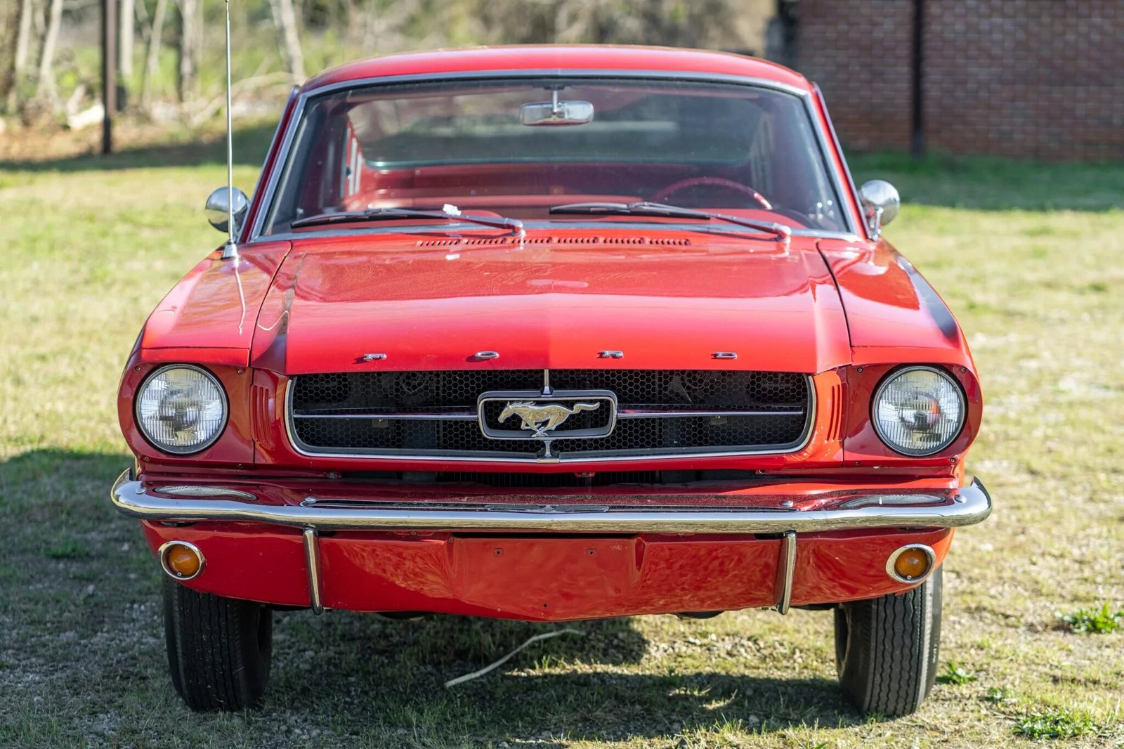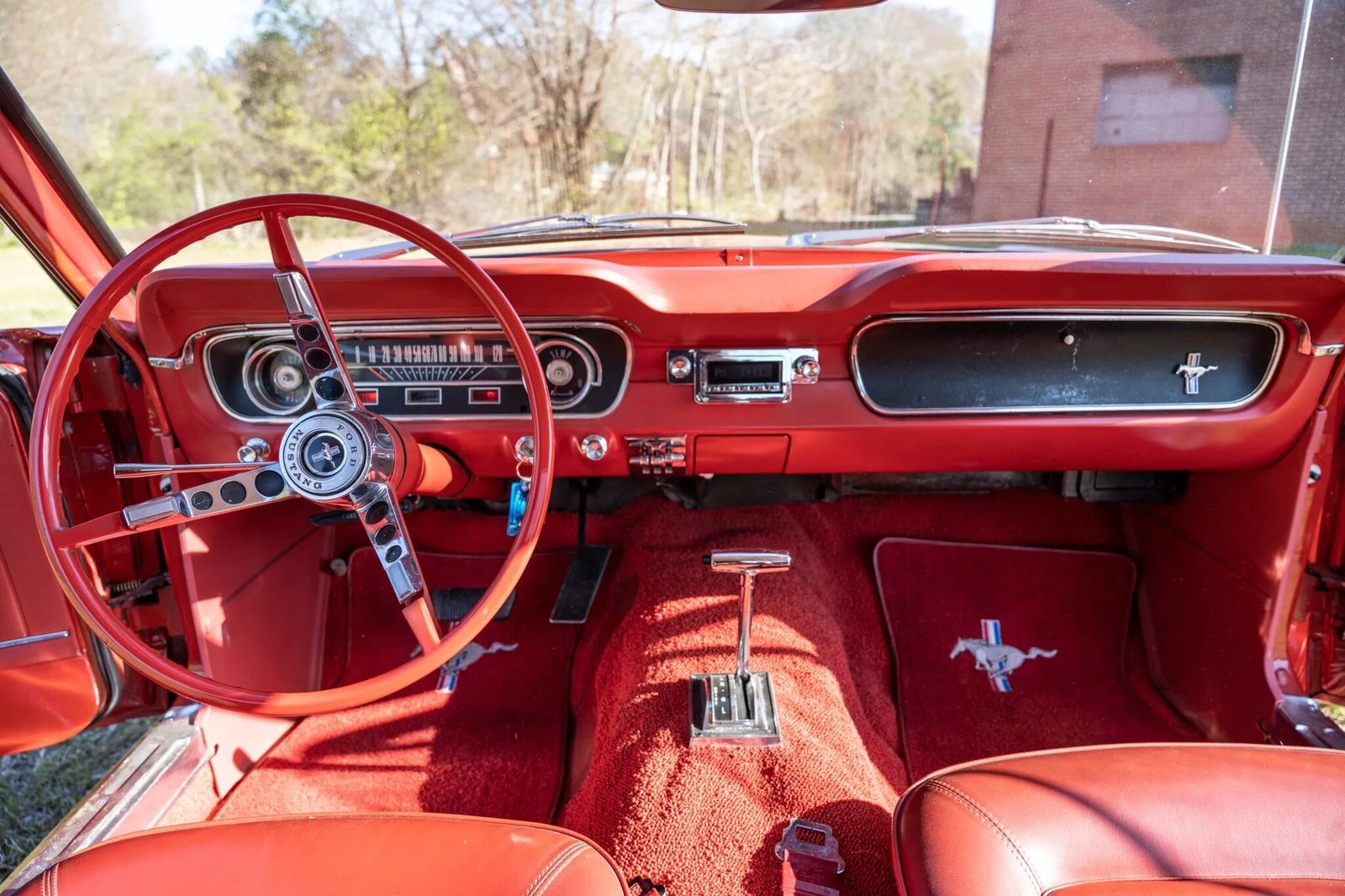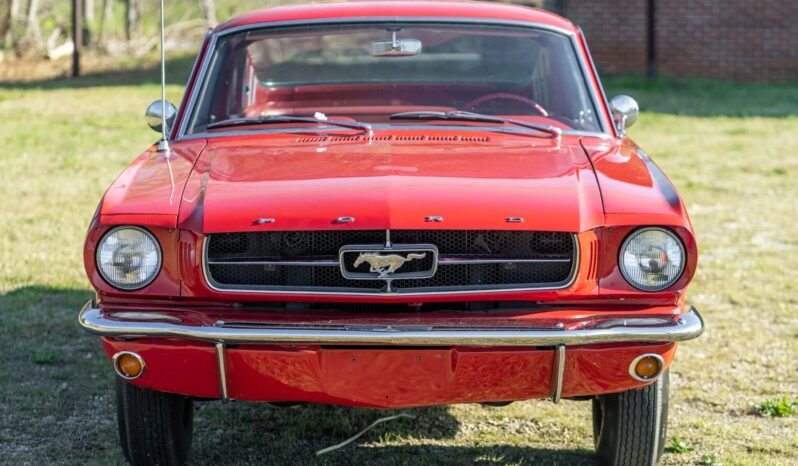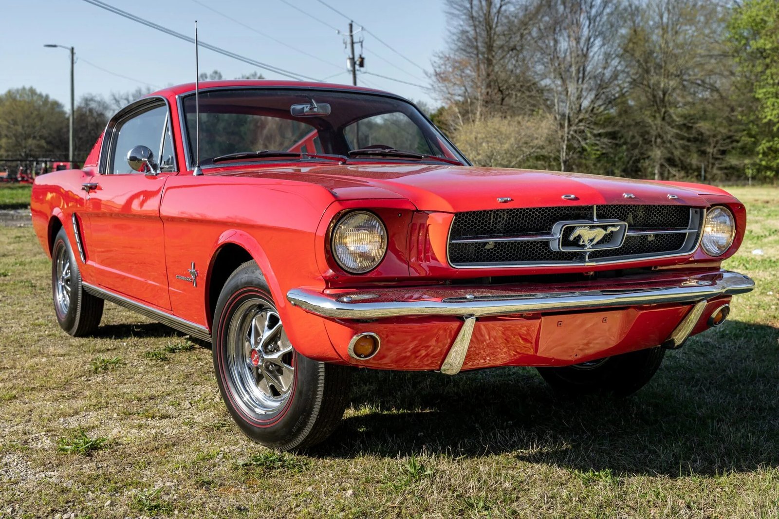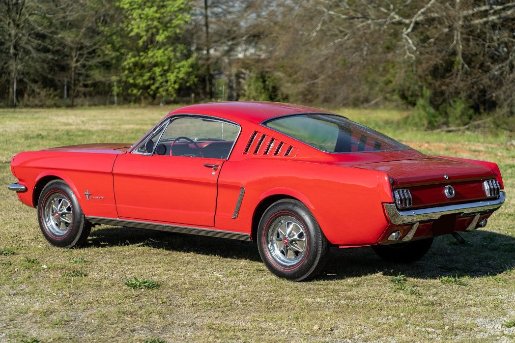 This 1965 Ford Mustang fastback has been refinished in red over red, and its 200ci inline-six is paired with a three-speed automatic transmission.