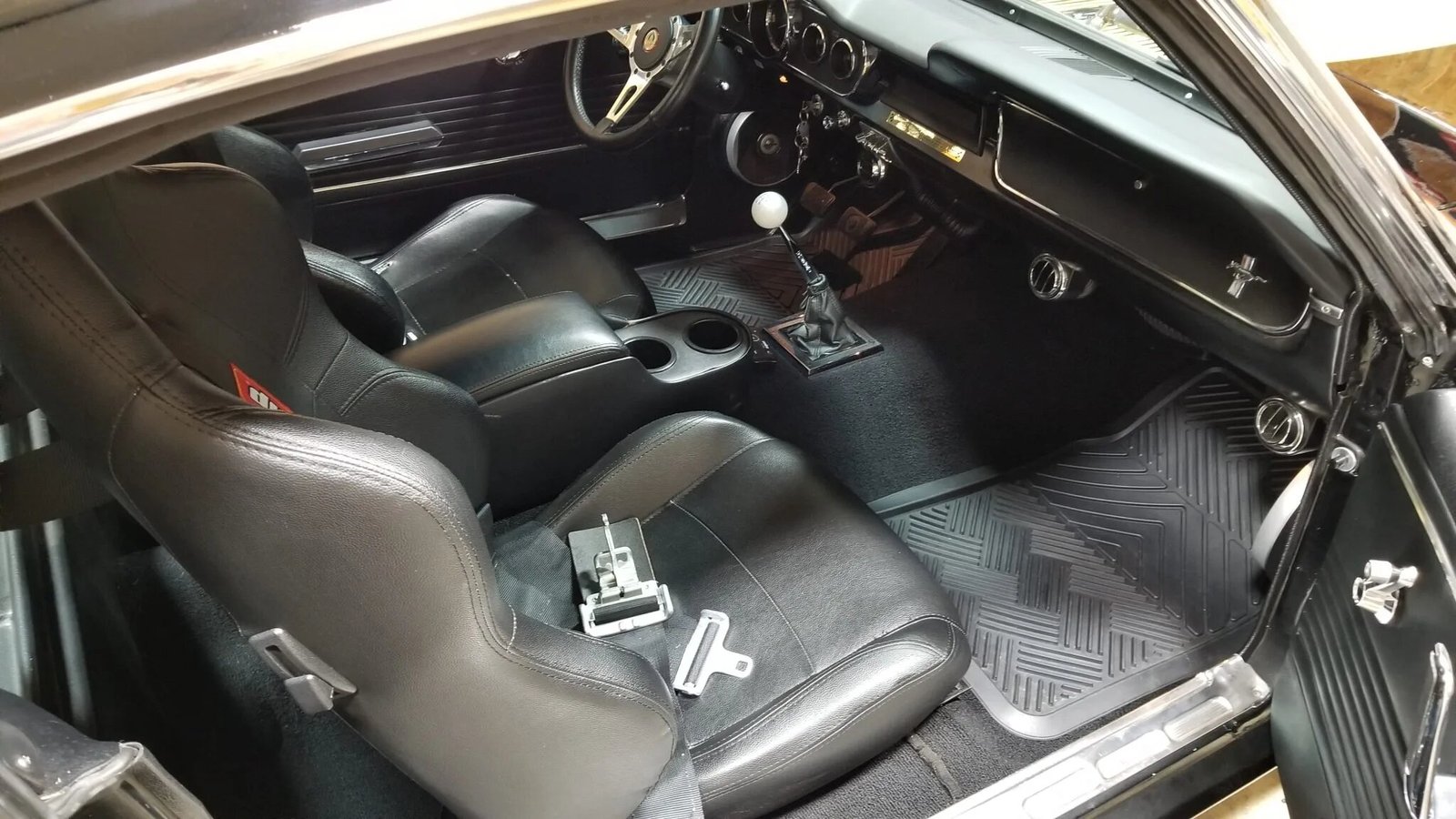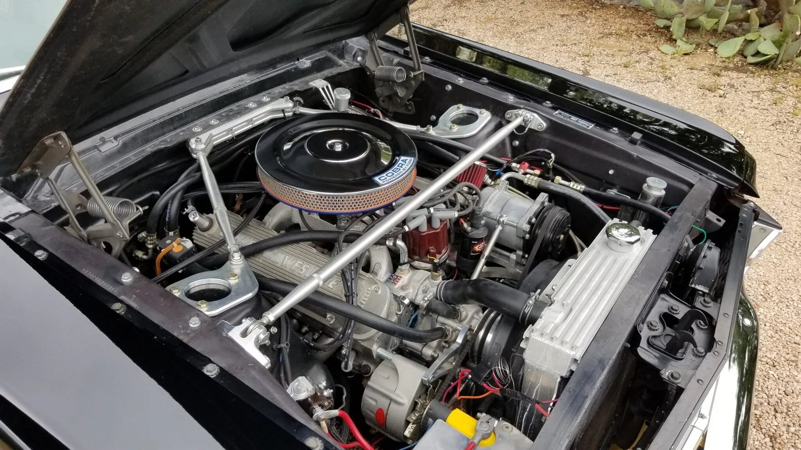 A replacement fiberglass GT350 hood, driver side quarter panel, tail panel, trunk floor, front fenders, and inner fenders were installed as well as a Dynacorn decklid and doors.