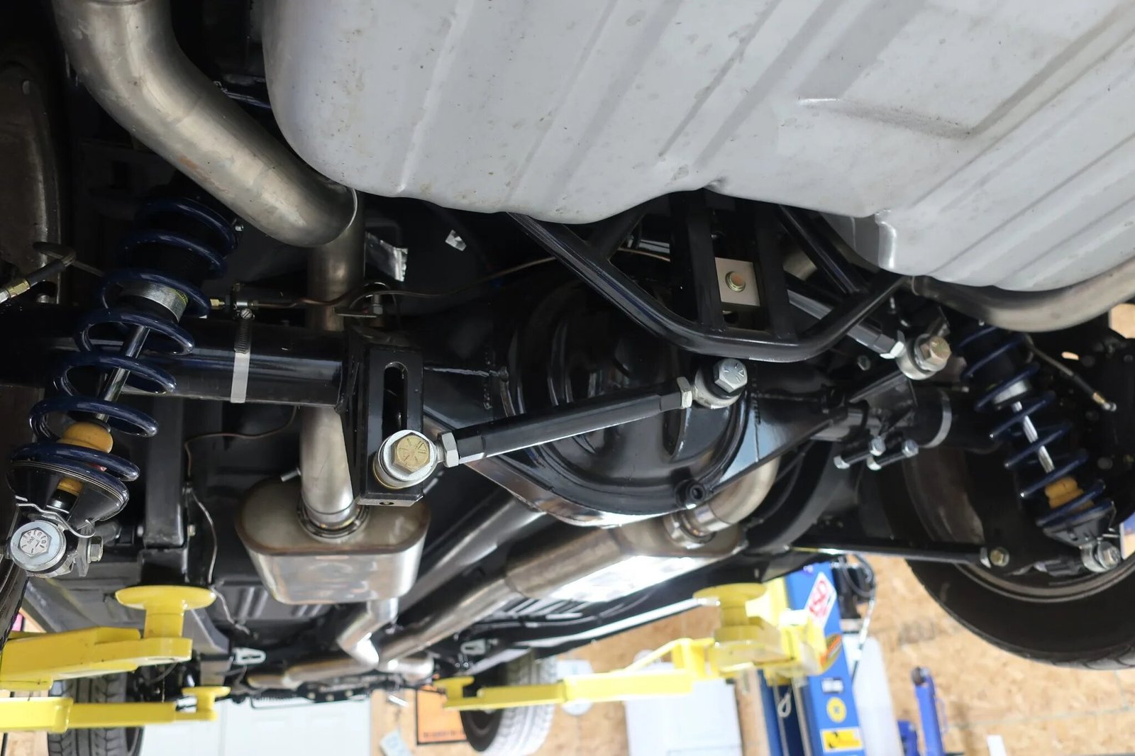 Staggered 17″ Vintage Wheel Works V48 are mounted with Kuhmo Ectsa PS31 tires measuring 225/45 up front and 235/45 out back. Braking is provided by a Wilwood master cylinder with a proportioning valve, Dynalite calipers and rotors at all four corners, and cu/nickel hard lines. The suspension was modified with the following components: Street or Track adjustable strut rods, Adjustable export brace and Monte Carlo bar, Tubular upper and lower control arms, Unisteer power-assisted rack and pinion, Global West strut tower supports, Bilstein Coilovers, Grab-a-trak 1 1/8″ swaybar, Heidts subframe connectors, Street or Track rear 3-link suspension and Watts link.