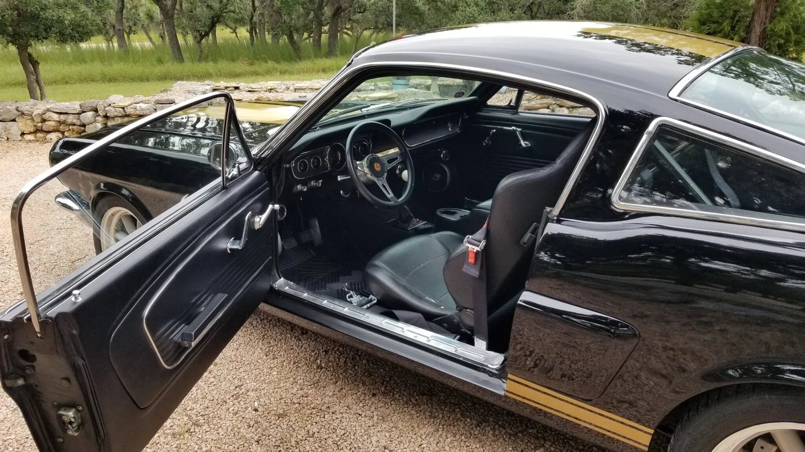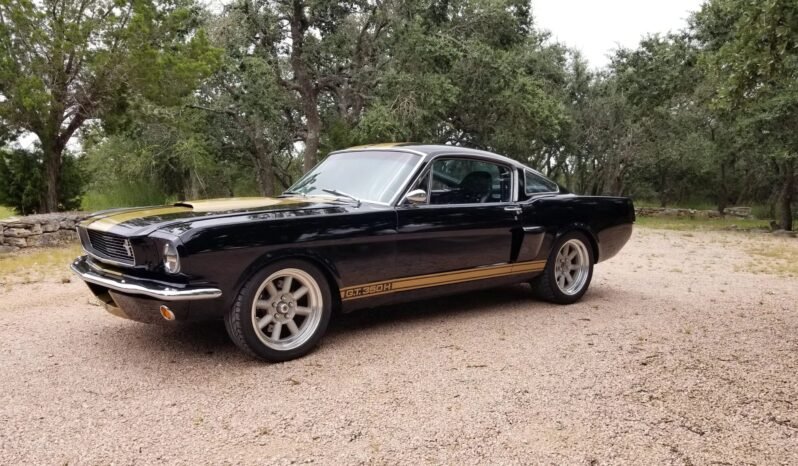 This 1965 Ford Mustang fastback is finished in black with gold stripes over a black interior and powered by a 363ci stroker V8 paired with a close-ratio Tremec T56 six-speed manual transmission and a Street or Track 9-inch rear axle with a Yukon positraction differential and Dutchman 31-spline axles.